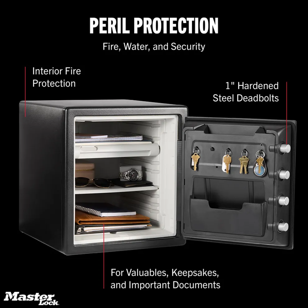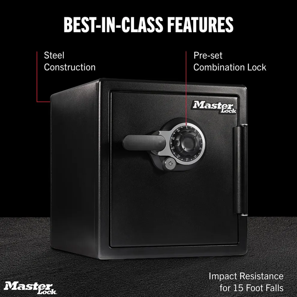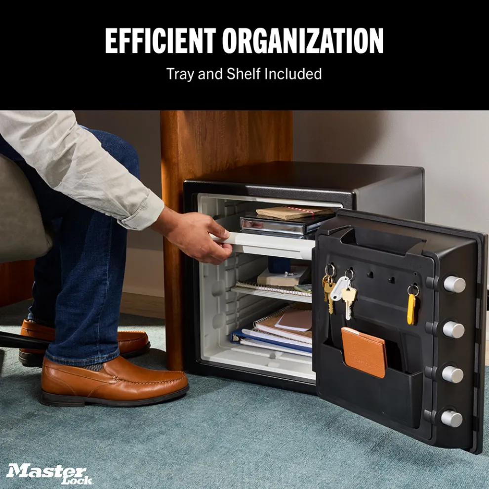 The Master Lock STW123DUBML Premium 2 Hour Fire and Water Safe offers the best protection in its class. Engineered from high-grade steel, it is designed, tested and UL Certified for unmatched performance. This safe is built to withstand extreme elements, providing 2-hour fire resistance in temperatures up to 1850° F and shielding against water for up to 24 hours. To defend against theft and impact, the door is fortified with 4 bolts, a pry-resistant hinge bar and a dual-key, combination lock. For added convenience, the interior features an organizational tray, shelf and door pocket. Plus, your safe is backed by a limited lifetime warranty—it’s covered for life.