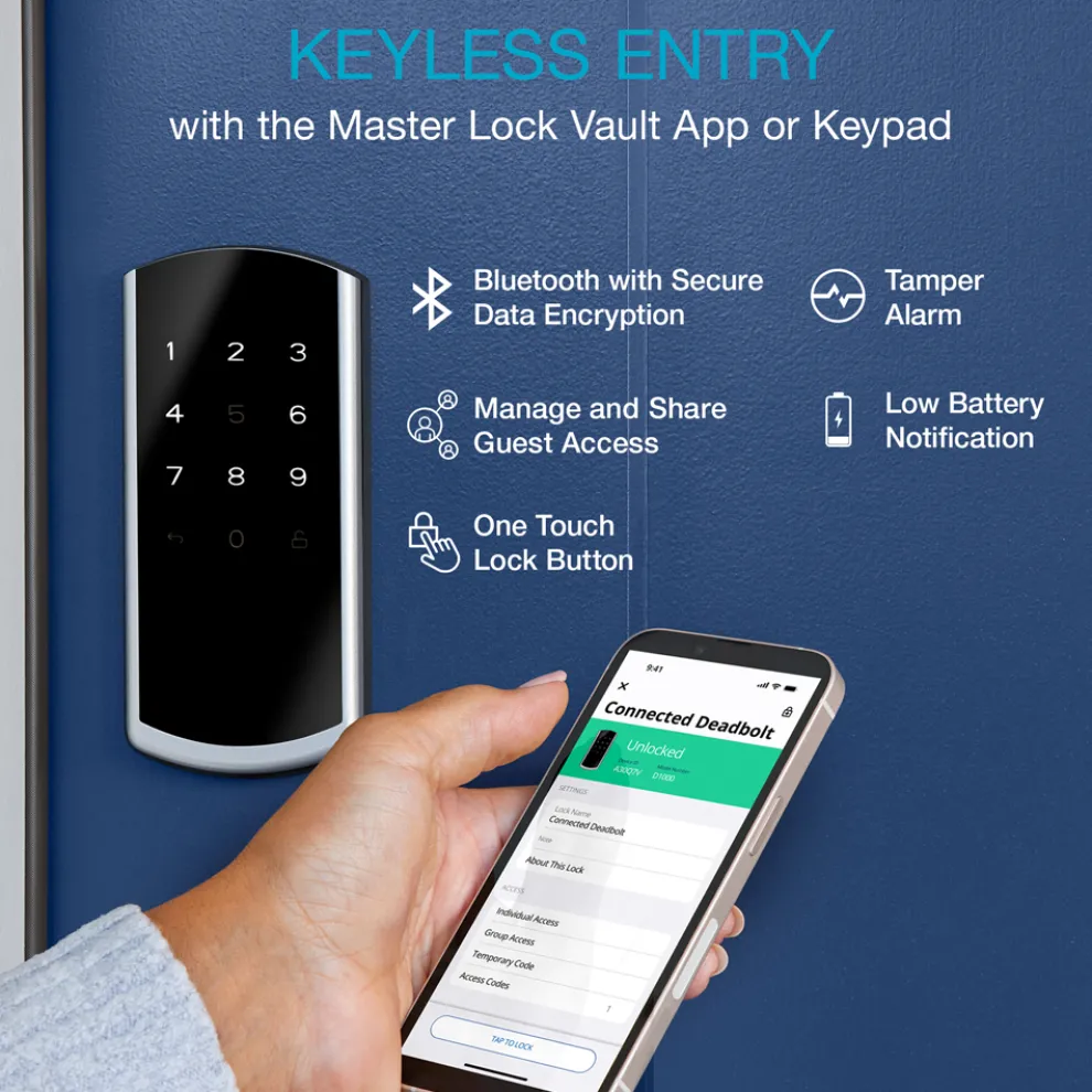 - Built-in Bluetooth® Technology – Easy connection to existing iOS or Android phone, provides streamlined door access through the Master Lock® Vault Enterprise software platform