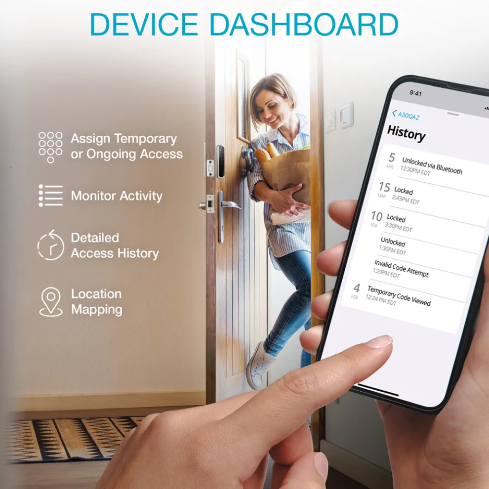 - Mobile Alerts and Notifications – Receive notifications when individuals unlock, lock and open the deadbolt. Low battery notification appears on the deadbolt as well as within the app.