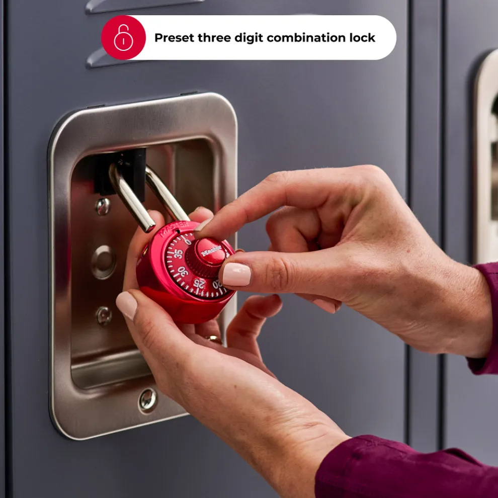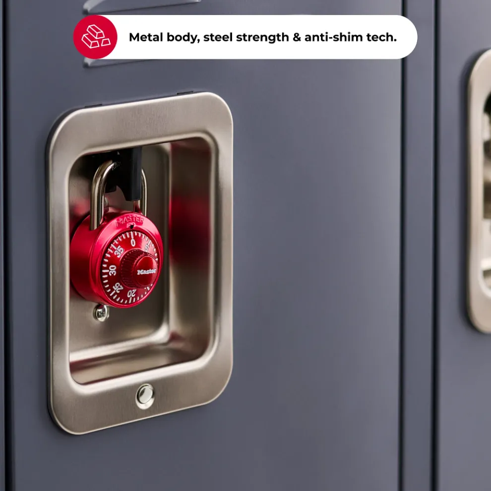 The Master Lock No. 1530DCM Standard Dial Combination Padlock features a 1-7/8in (48mm) wide metal body for durability, with an anodized aluminum finish. The 9/32in (7mm) diameter shackle is 3/4in (19mm) long and made of hardened steel, offering extra resistance to cutting and sawing. The 3-digit combination offers keyless convenience. The locking mechanism features anti-shim technology, offering maximum security. The bright metallic colors simplify locker identification. The Limited Lifetime Warranty provides peace of mind from a brand you can trust.
