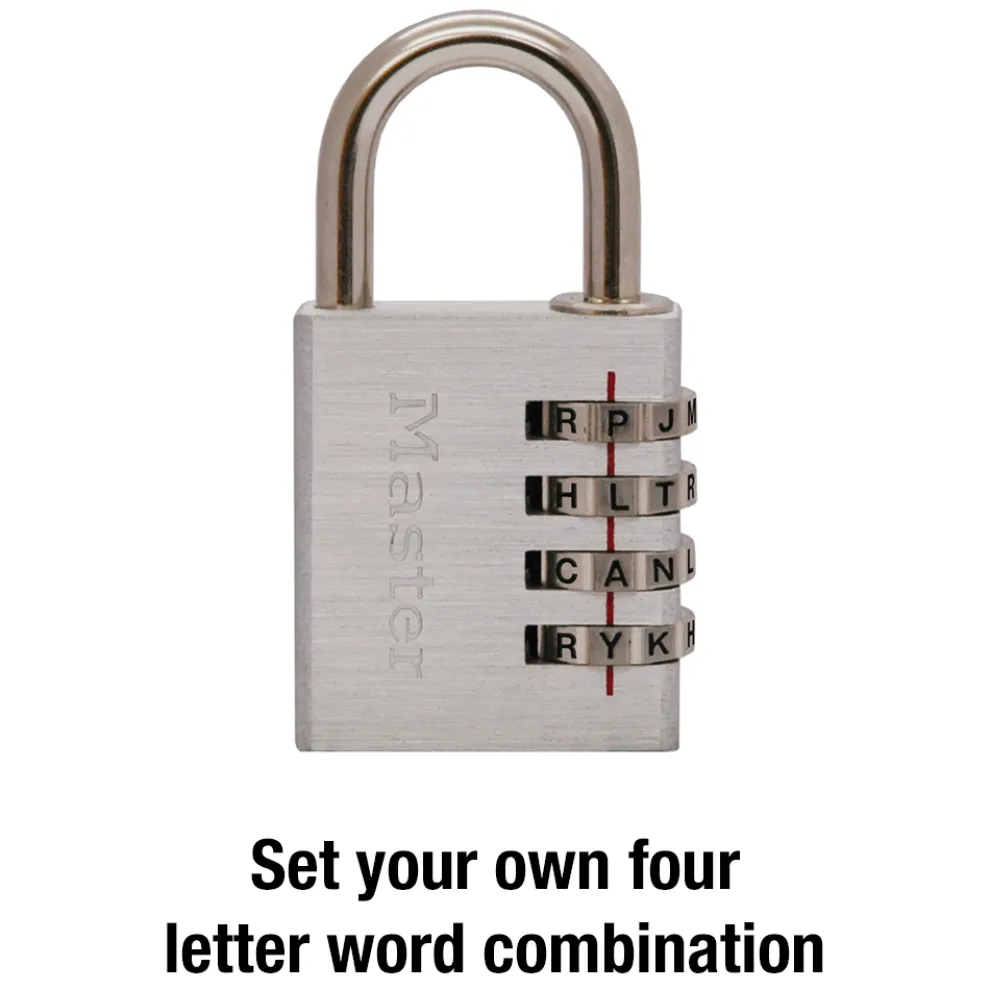 The Master Lock No. 643DWD Set Your Own WORD Combination Padlock features a 1-9/16in (40mm) wide metal body for durability. The 1/4in (6mm) diameter shackle is 7/8in (22mm) long and made of nickel plated steel, offering resistance to cutting and sawing. The 4 dial combination security offers keyless convenience. The Limited Lifetime Warranty provides peace of mind from a brand you can trust.