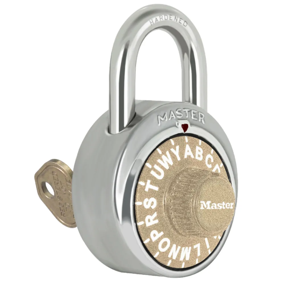 The Master Lock No. 1585GLD Letter Lock™ combination padlock with key control feature for supervisory access use letters instead of numbers for easier combination recall with an easy-to-remember phrase for additional convenience. These locks also include many enhanced security features like the exclusive BlockGuard® Anti-Shim technology and hardened steel shackles. Designed to fit lockers with a padlock eye of at least 5/16in (8mm) diameter, these locks provide multiple combination options to fit your needs.