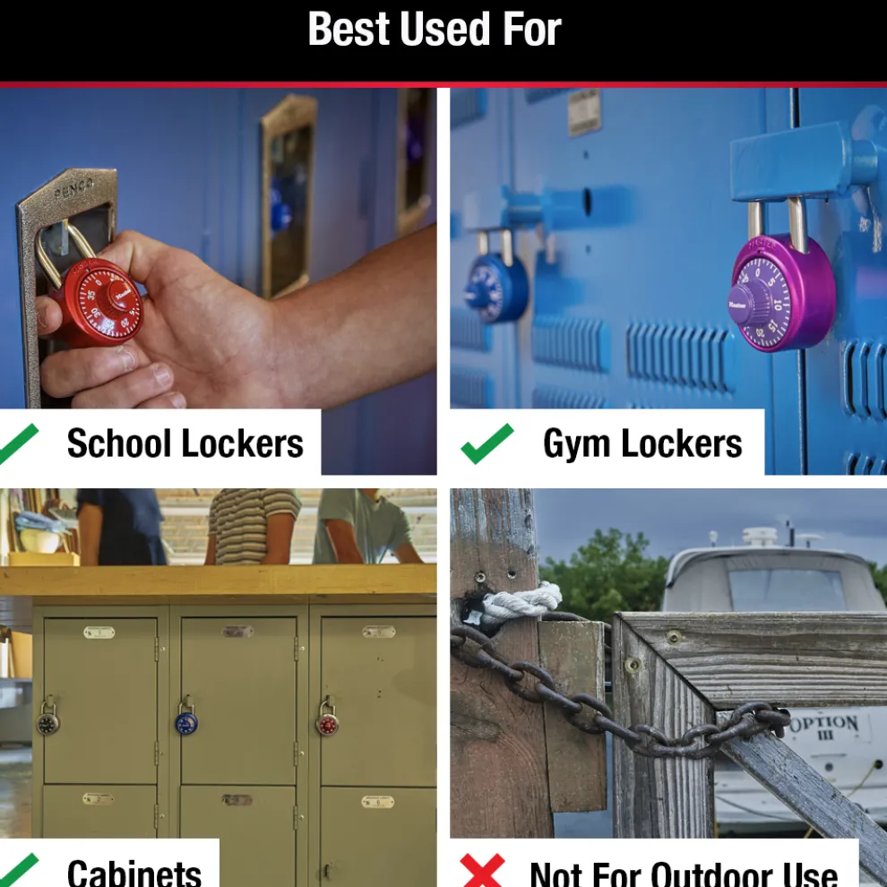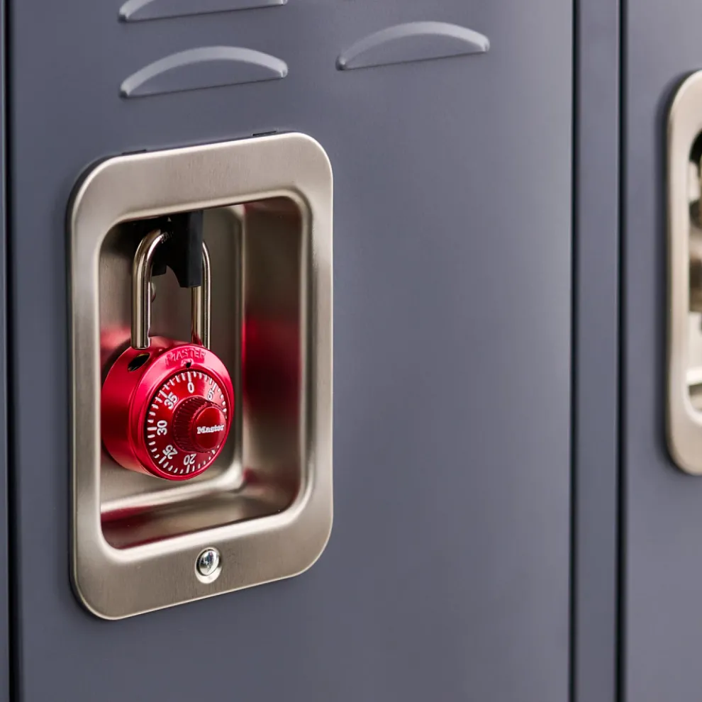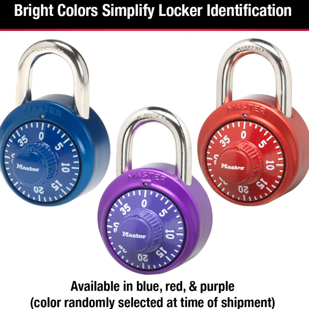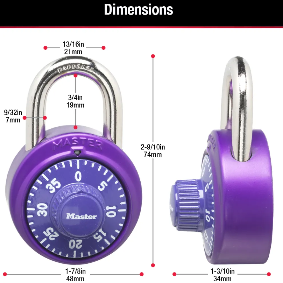 The Master Lock No. 1530T Standard Dial Combination Padlock features a 1-7/8in (48mm) wide metal body for durability, with an anodized aluminum finish. The 9/32in (7mm) diameter shackle is 3/4in (19mm) long and made of hardened steel, offering extra resistance to cutting and sawing. The 3-digit combination offers keyless convenience. The locking mechanism features anti-shim technology, offering maximum security. The bright metallic colors simplify locker identification. The Limited Lifetime Warranty provides peace of mind from a brand you can trust.