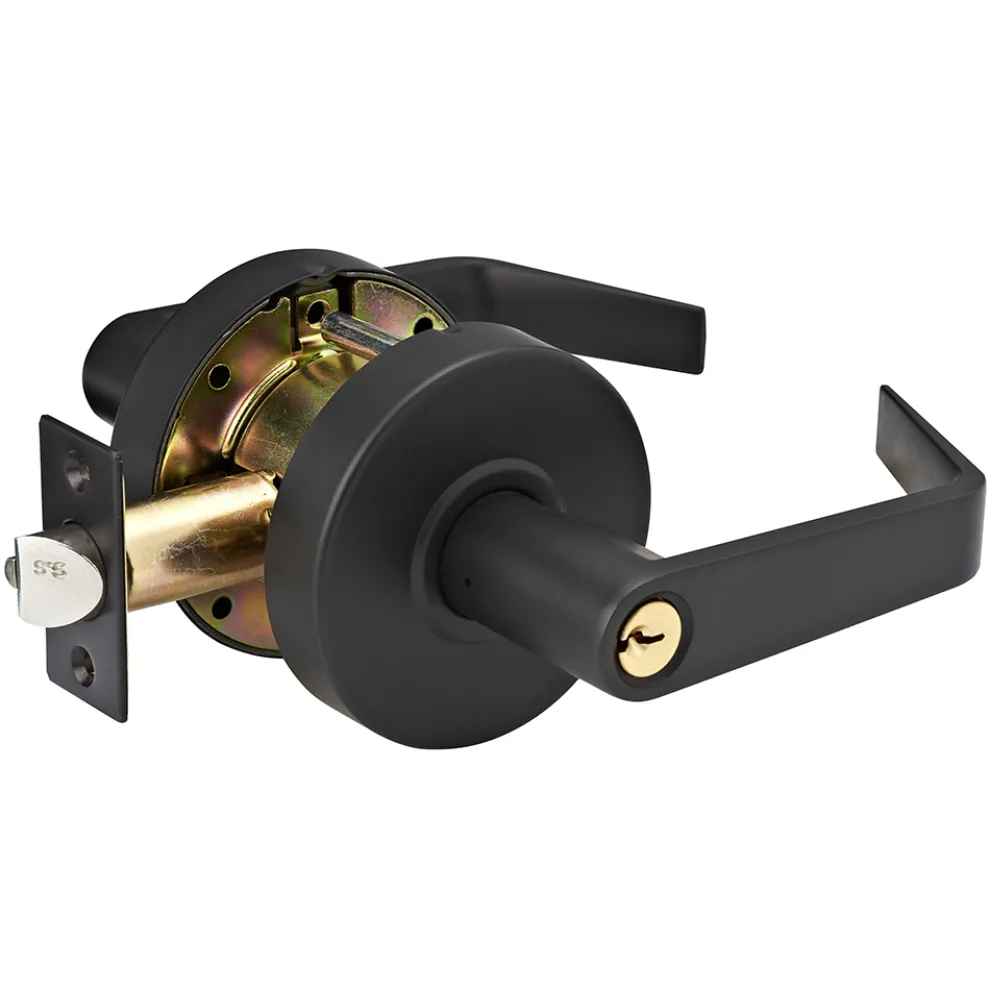 - For locked storage room application. Operated by lever inside or key in outside lever. Outside lever is always locked. Inside lever is always unlocked