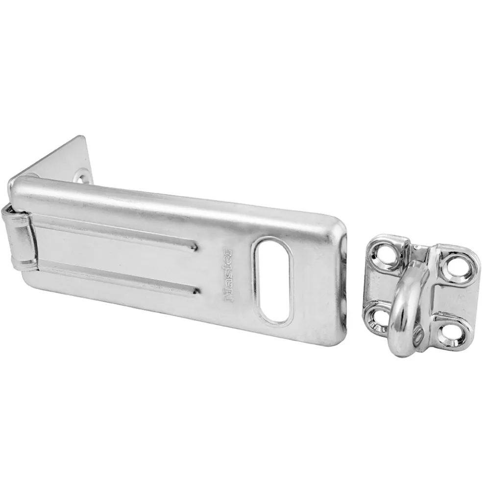The Master Lock No. 704DPF Hasp features a 4-1/2in (11cm) long hard wrought steel body. The zinc plated hardened steel hasp provides added strength and weatherability. The hardened steel staple and locking eye resist cutting and sawing. The ribbed hasp plate offers extra strength, and hardened steel locking eye provides strong cut resistance. The Limited Lifetime Warranty provides peace of mind from a brand you can trust.