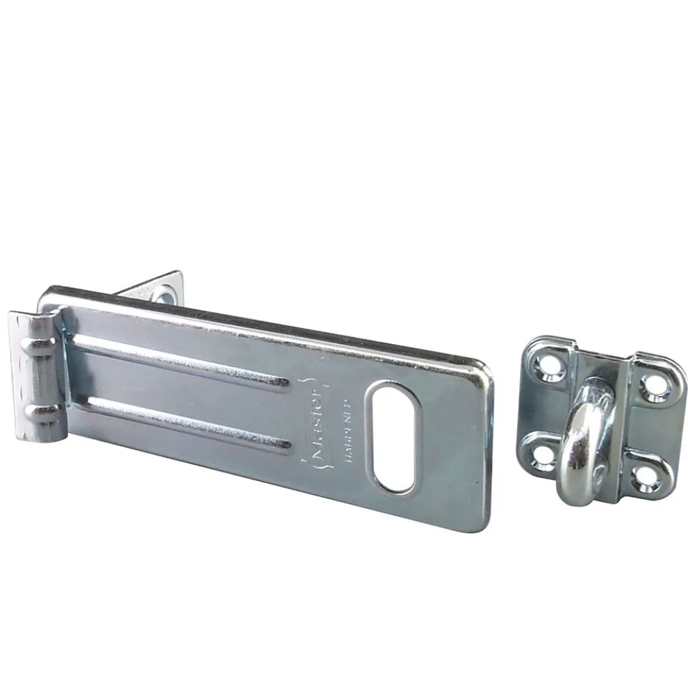 The Master Lock No. 706D Hasp features a 6in (15cm) long hard wrought steel body. The zinc plated hardened steel hasp provides added strength and weatherability. The hardened steel staple and locking eye resist cutting and sawing. The ribbed hasp plate offers extra strength, and hardened steel locking eye provides strong cut resistance. The Limited Lifetime Warranty provides peace of mind from a brand you can trust.