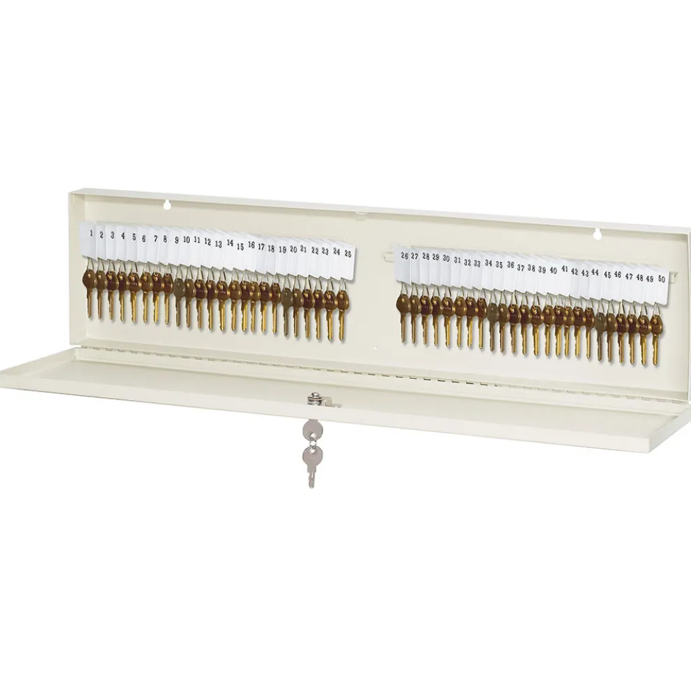 - Heavy duty steel construction with full length, hinged door and built-in slotted key racks