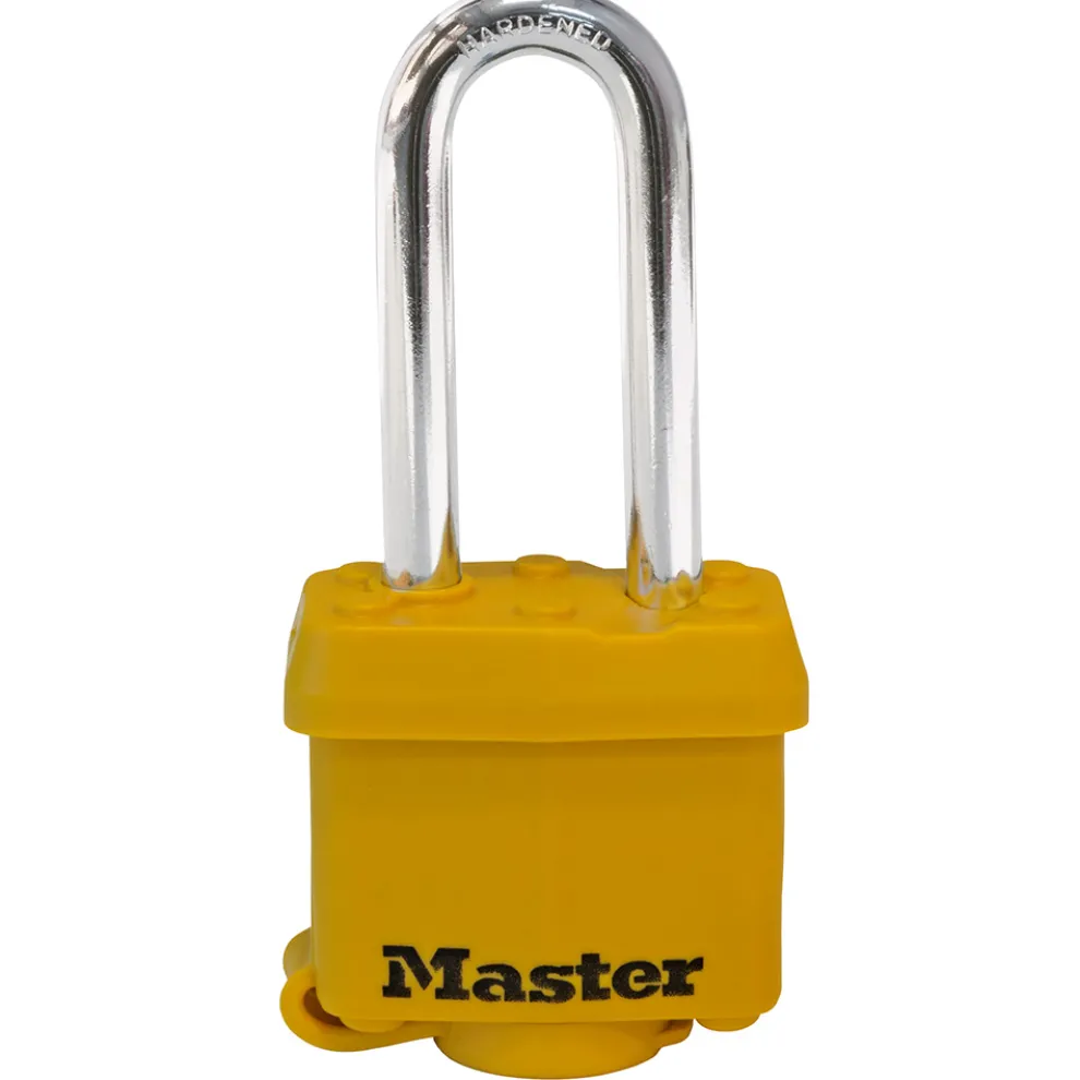 The Master Lock No. 315KALH Covered Laminated Padlock features a 1-9/16in (40mm) wide laminated steel body for superior strength and a 2in (51mm), 9/32in (7mm) diameter hardened steel shackle for superior cut resistance. A yellow, weather resistant thermoplastic cover provides protection against environmental elements such as moisture, dirt & grim. Dual ball bearings locking for maximum pry resistance and a non-rekeyable 4-pin W1 cylinder offers strong pick resistance.