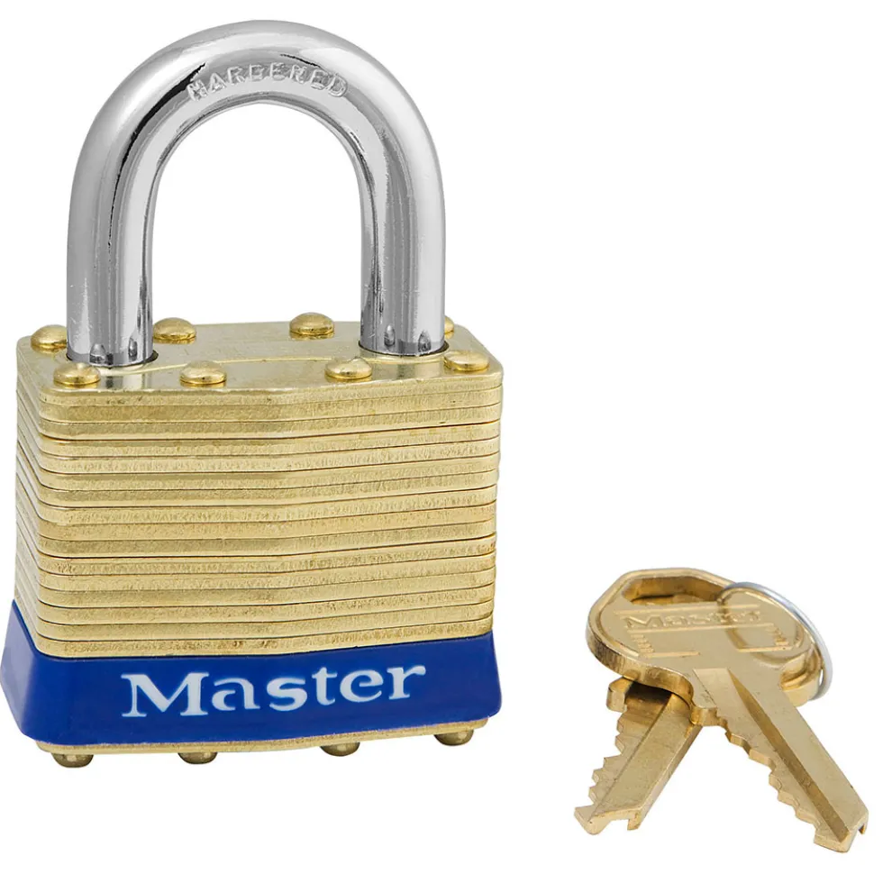 The Master Lock No. 82 Laminated Brass Padlock features a 1-3/4in (44mm) wide laminated brass body for superior corrosion resistance and a 15/16in (24mm) tall, 5/16in (8mm) diameter hardened steel, chrome plated shackle for excellent cut and weather resistance. Dual ball bearings locking for maximum pry resistance making it ideal for industrial applications and the rekeyable, 5-pin W27 cylinder helps prevent picking.