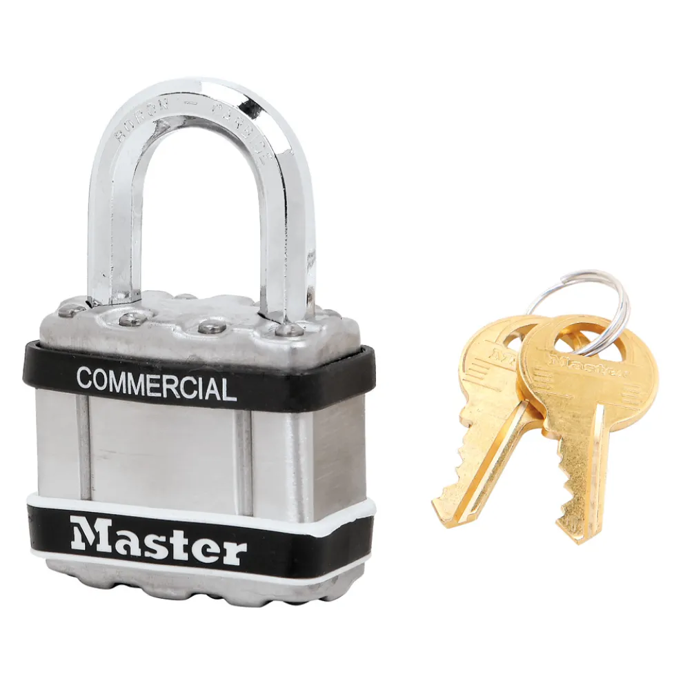 The Master Lock Commercial Magnum® No. M1KASTS Laminated Steel Padlock with Stainless Steel Body Cover, Keyed Alike – multiple locks open with the same key – features a 1-3/4in (44mm) wide laminated steel body encased in a stainless steel body cover for maximum strength and weatherability. The 5/16in (8mm) diameter octagonal shackle is 1in (25mm) long and made of chrome-plated boron carbide, 50% harder than hardened steel, offering maximum resistance to cutting and sawing. The 4-pin cylinder prevents picking and the dual locking ball bearings provide maximum resistance against prying and hammering. Commercial Magnum offers a higher level of weatherability and security for applications in outdoor, corrosive and caustic environments.