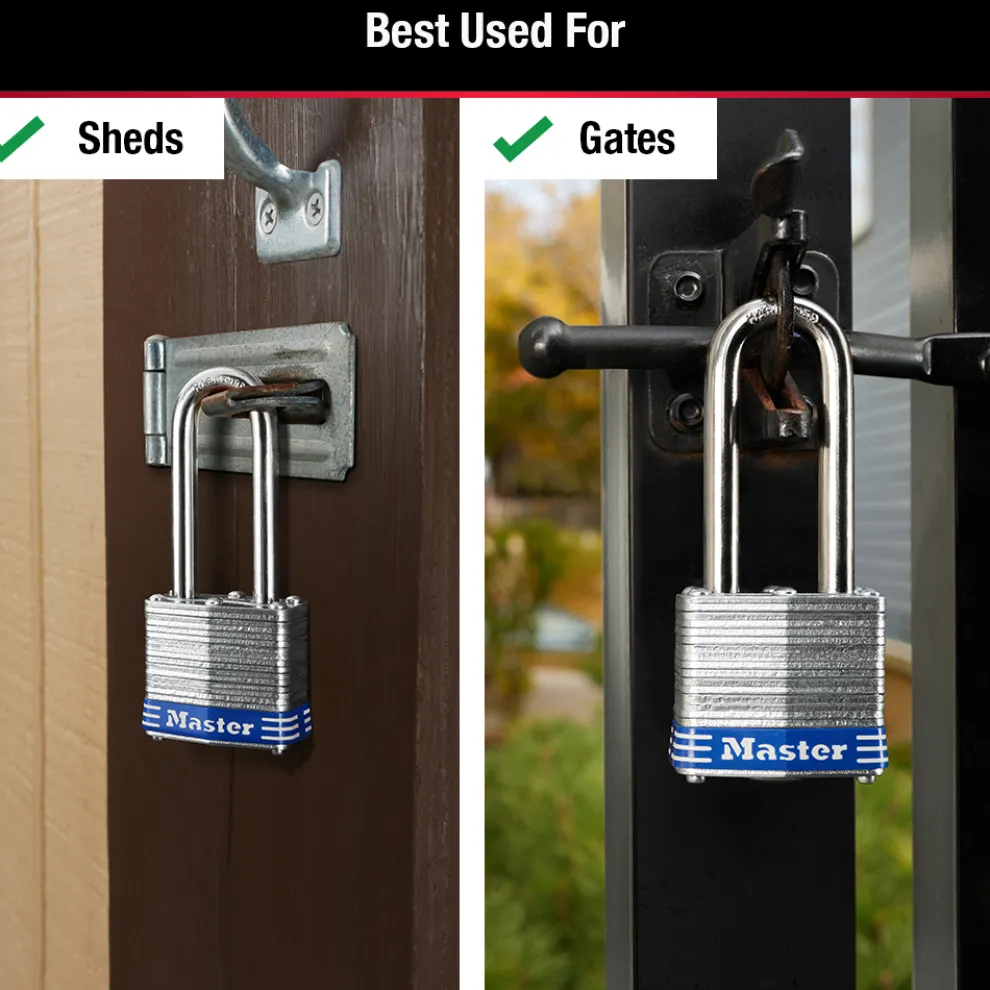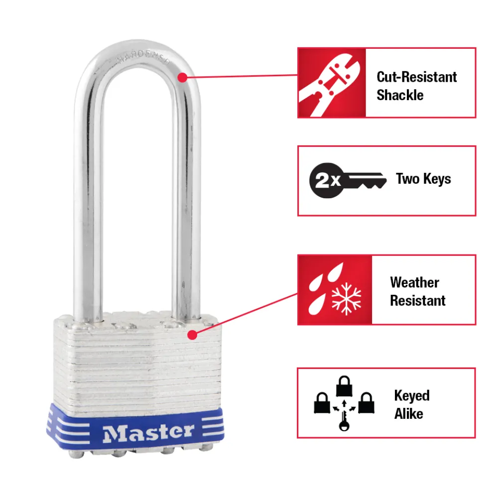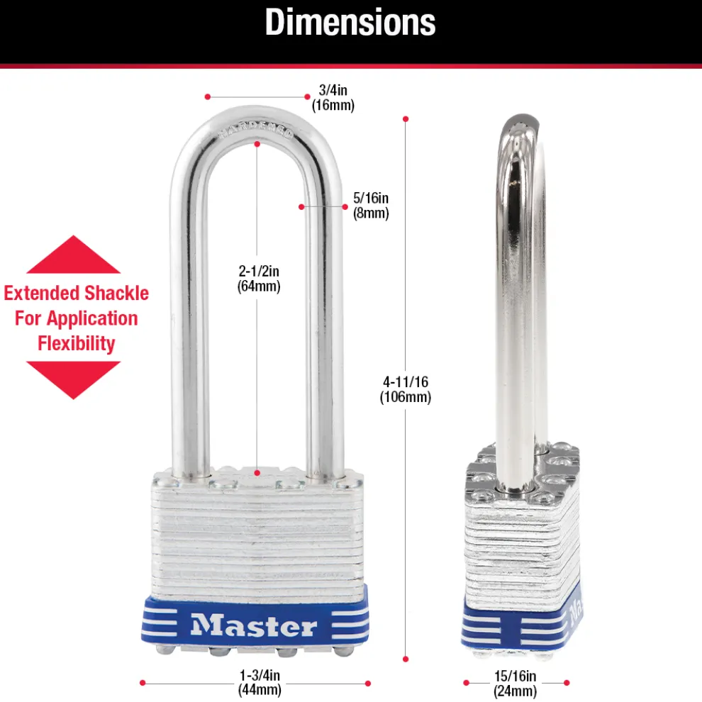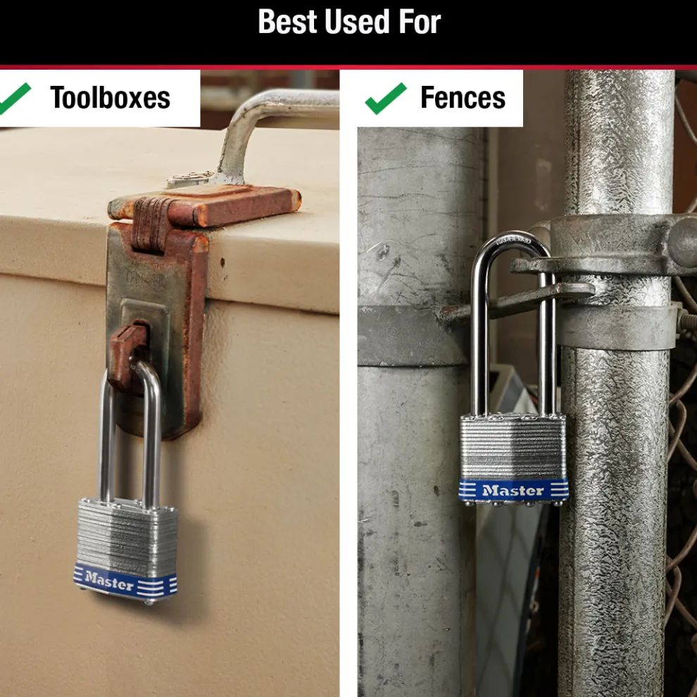 The Master Lock No. 1TRILJ Laminated Padlocks feature a 1-3/4in (44mm) wide laminated steel body for maximum strength and reliability. The 5/16in (8mm) diameter shackle is 2in (51mm) long and made of hardened steel, offering extra resistance to cutting and sawing. The 4-pin cylinder prevents picking and the dual locking ball bearings provide resistance against prying and hammering. The Limited Lifetime Warranty provides peace of mind from a brand you can trust.