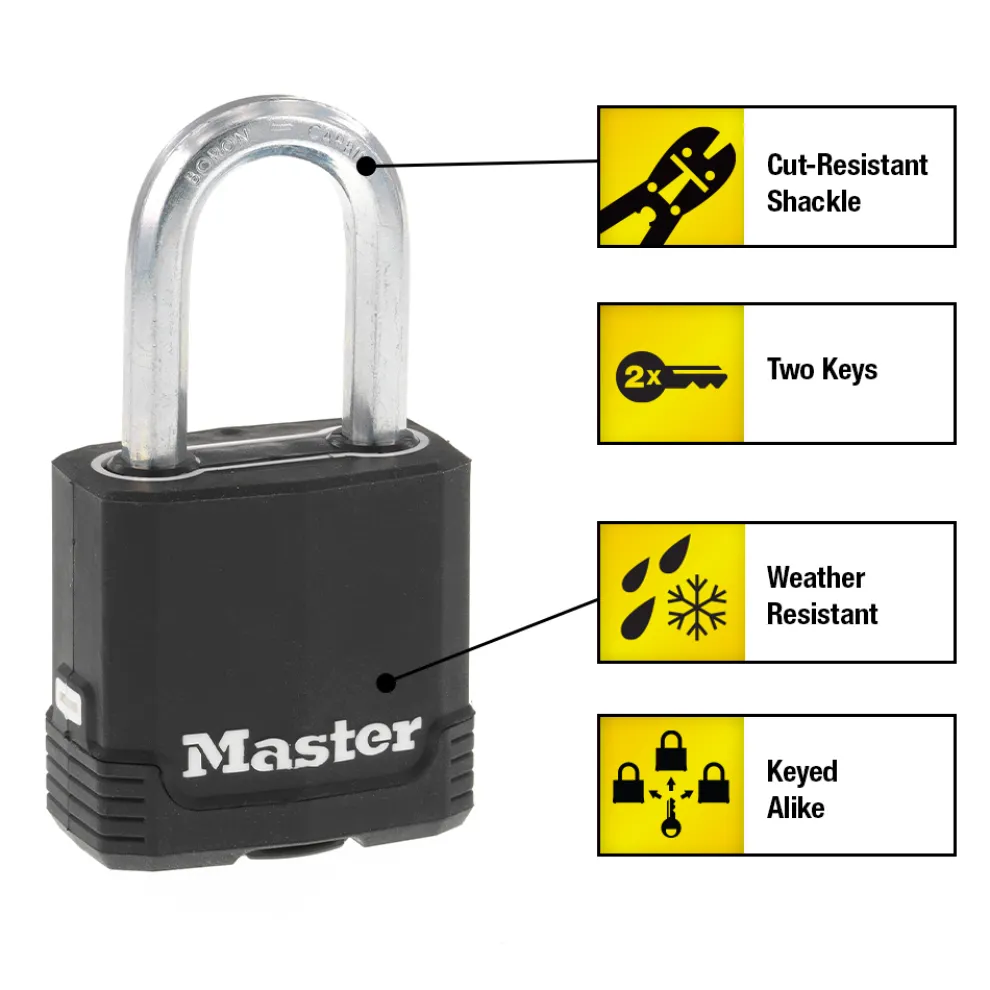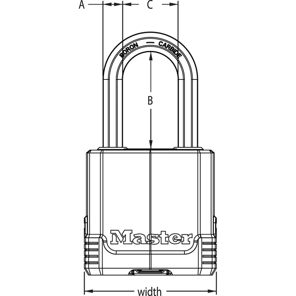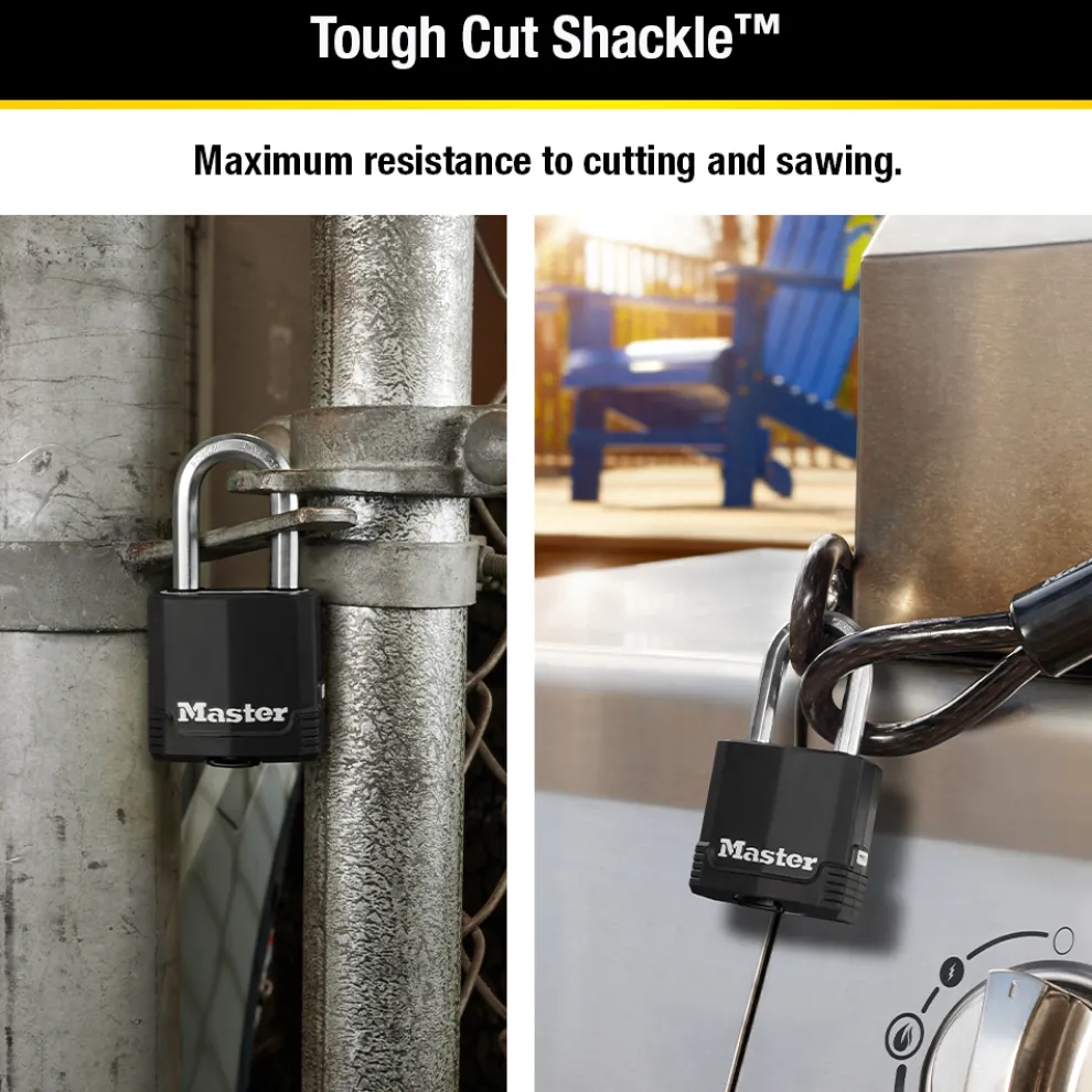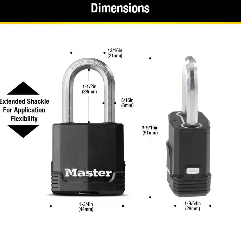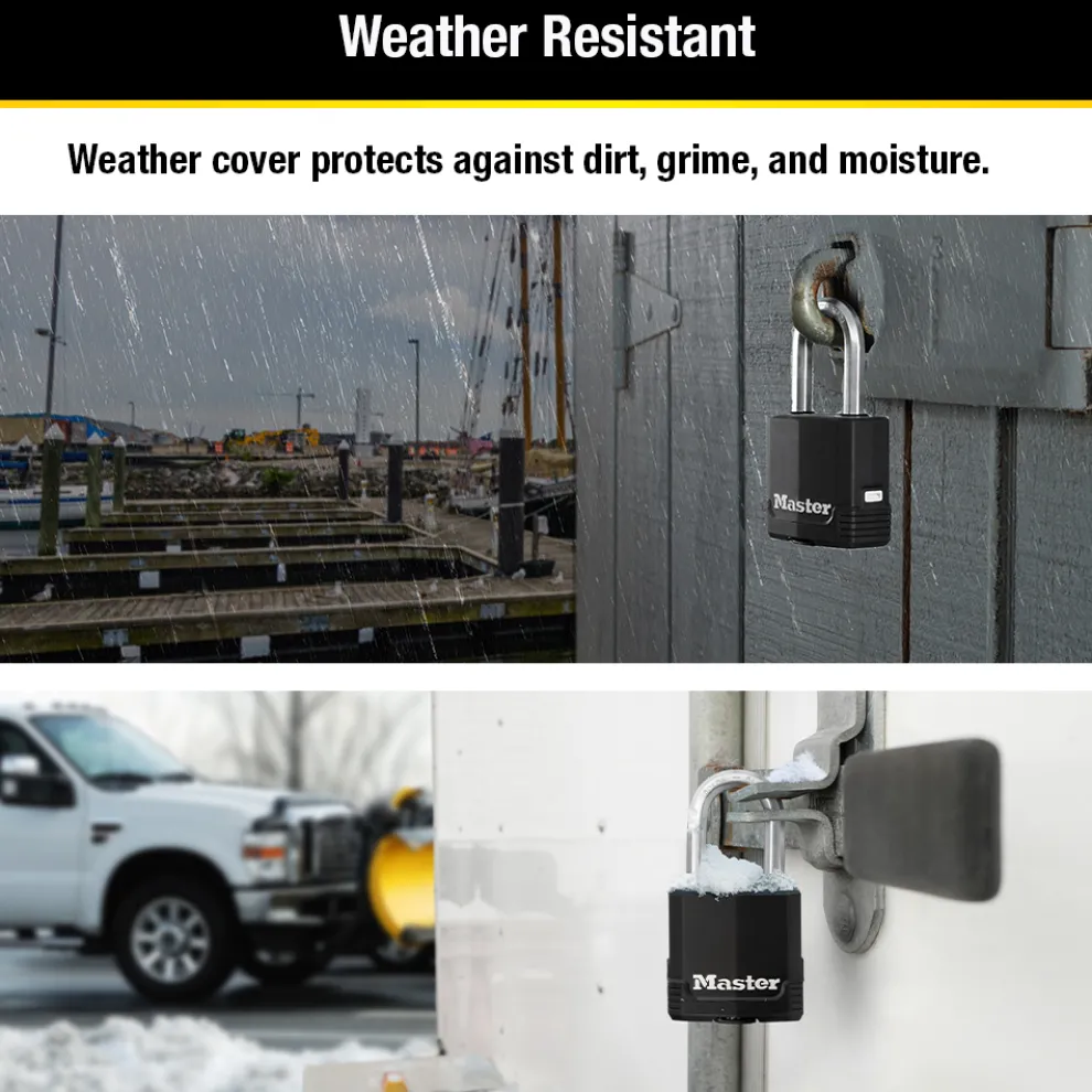 - Dual-Armor® construction: 1-7/8in (48mm) wide laminated steel core with weather resistant cover, shackle seals, and keyway cover protects against snow, rain, dirt, mud, grime and salt