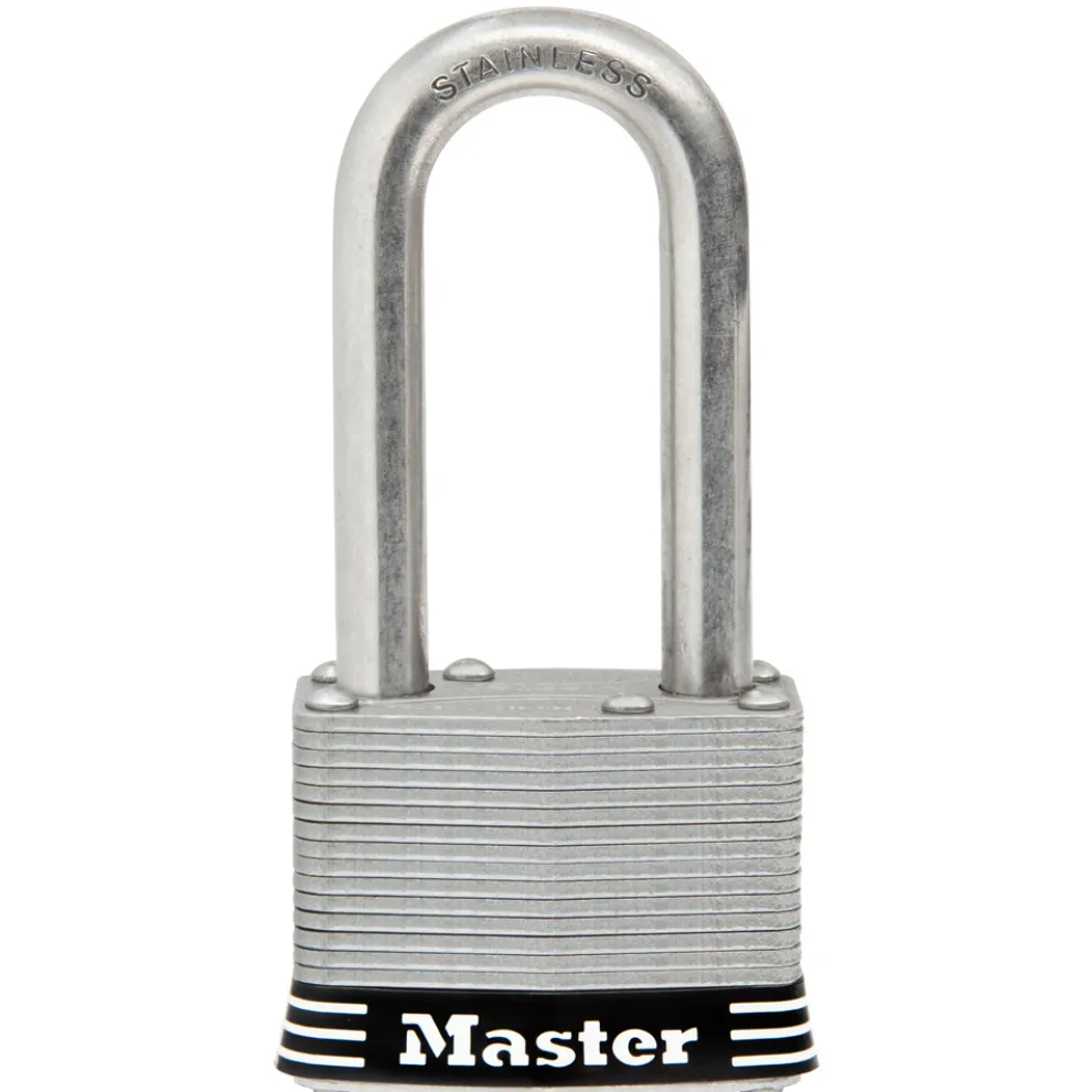 The Master Lock No. 1SSKADLH Stainless Steel Padlock features a 1-3/4in (44mm) wide laminated stainless steel body for maximum strength, reliability, and weather resistance. The 5/16in (8mm) diameter shackle is 2in (51mm) long and made of stainless steel, offering extra resistance to cutting, sawing, and weather. The 4-pin cylinder prevents picking and the dual locking ball bearings provide resistance against prying and hammering. The Lifetime Guarantee provides peace of mind from a brand you can trust.