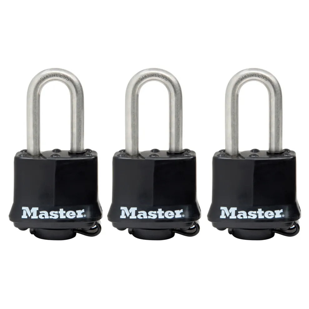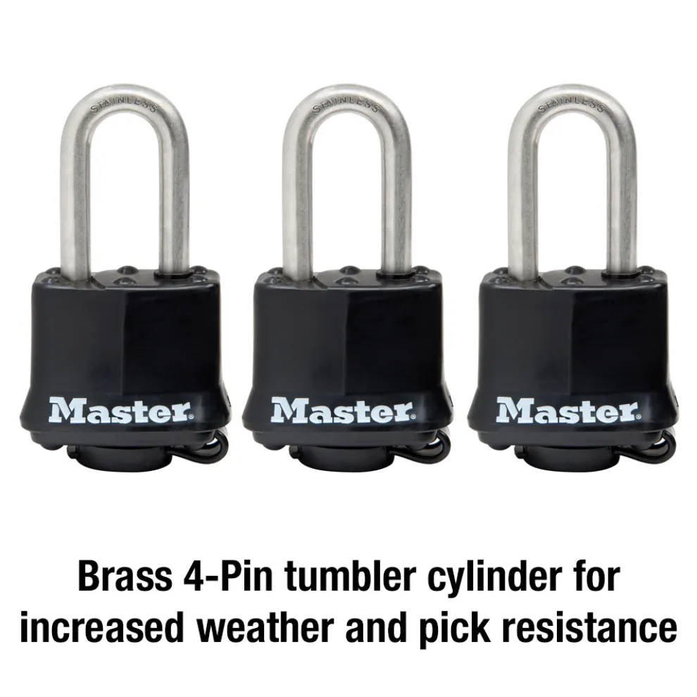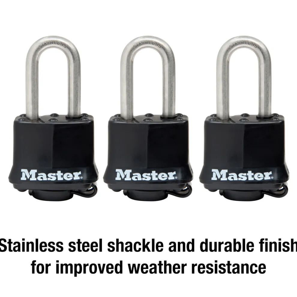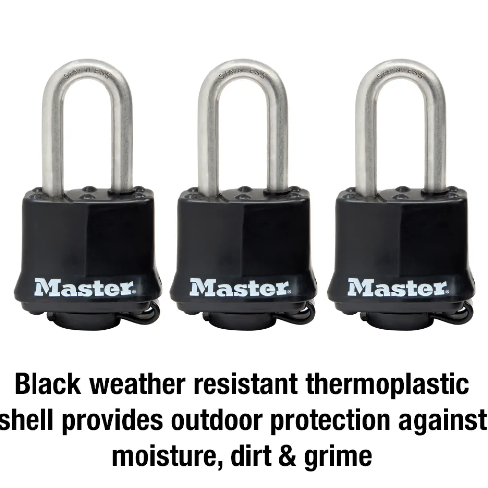 The Master Lock No. 311SSTRILF Stainless Steel Padlocks feature a 1-9/16in (40mm) laminated steel body design, with a tough weather coated finish for maximum strength and reliability. The 9/32in (7mm) diameter shackle is 1-1/2in (38mm) long and made of stainless steel, offering extra resistance to cutting, sawing, and weather. A black weather resistant thermoplastic shell is designed to add protection against moisture, dirt and grime. The 4-pin cylinder prevents picking and the dual locking ball bearings provide resistance against prying and hammering. The Lifetime Guarantee provides peace of mind from a brand you can trust.