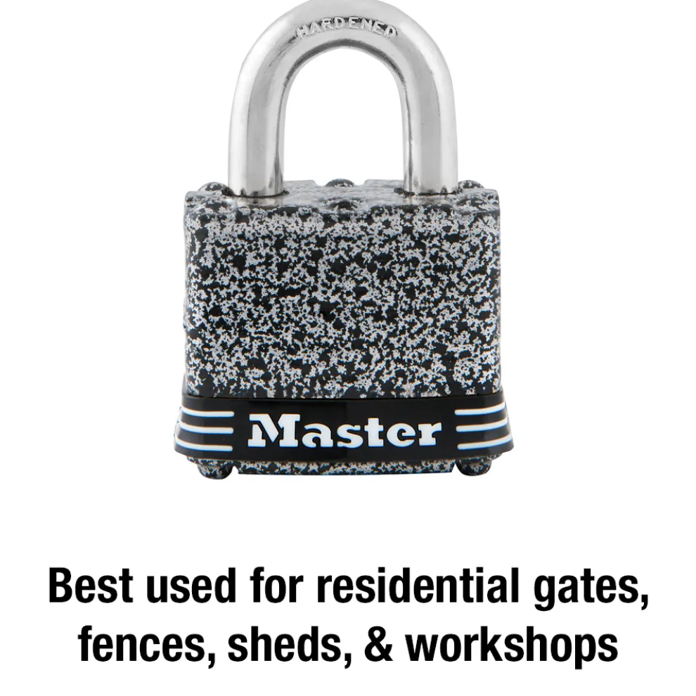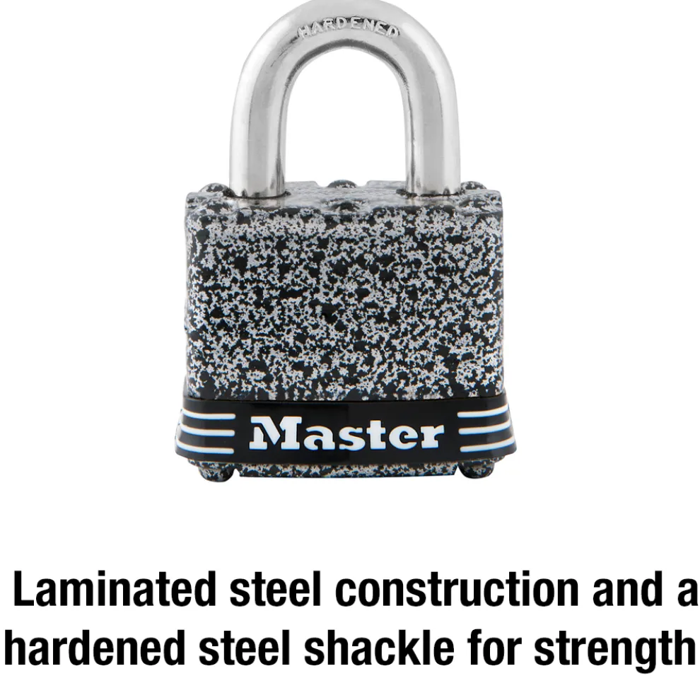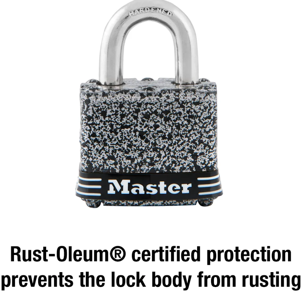The Master Lock No. 380D Laminated Padlock features a 1-9/16in (40mm) wide laminated steel body for maximum strength and reliability. The Rust-Oleum® Certified finish provides a lifetime guarantee against rusting on the lock body. The 9/32in (7mm) diameter shackle is 1-1/8in (29mm) long and made of hardened steel, offering extra resistance to cutting and sawing. The 4-pin cylinder prevents picking and the dual locking ball bearings provide resistance against prying and hammering. The Limited Lifetime Warranty provides peace of mind from a brand you can trust. Rust-Oleum® Certified Protection is a registered trademark of Rust-Oleum® Corporation.