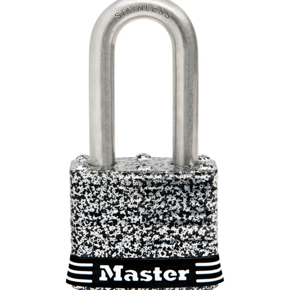 The Master Lock No. 3SSKADLF Stainless Steel Padlock features a 1-9/16in (40mm) laminated steel body design, with a tough weather coated finish for maximum strength and reliability. The 9/32in (7mm) diameter shackle is 1-1/2in (38mm) long and made of stainless steel, offering extra resistance to cutting, sawing, and weather. The 4-pin cylinder prevents picking and the dual locking ball bearings provide resistance against prying and hammering. The Lifetime Guarantee provides peace of mind from a brand you can trust.
