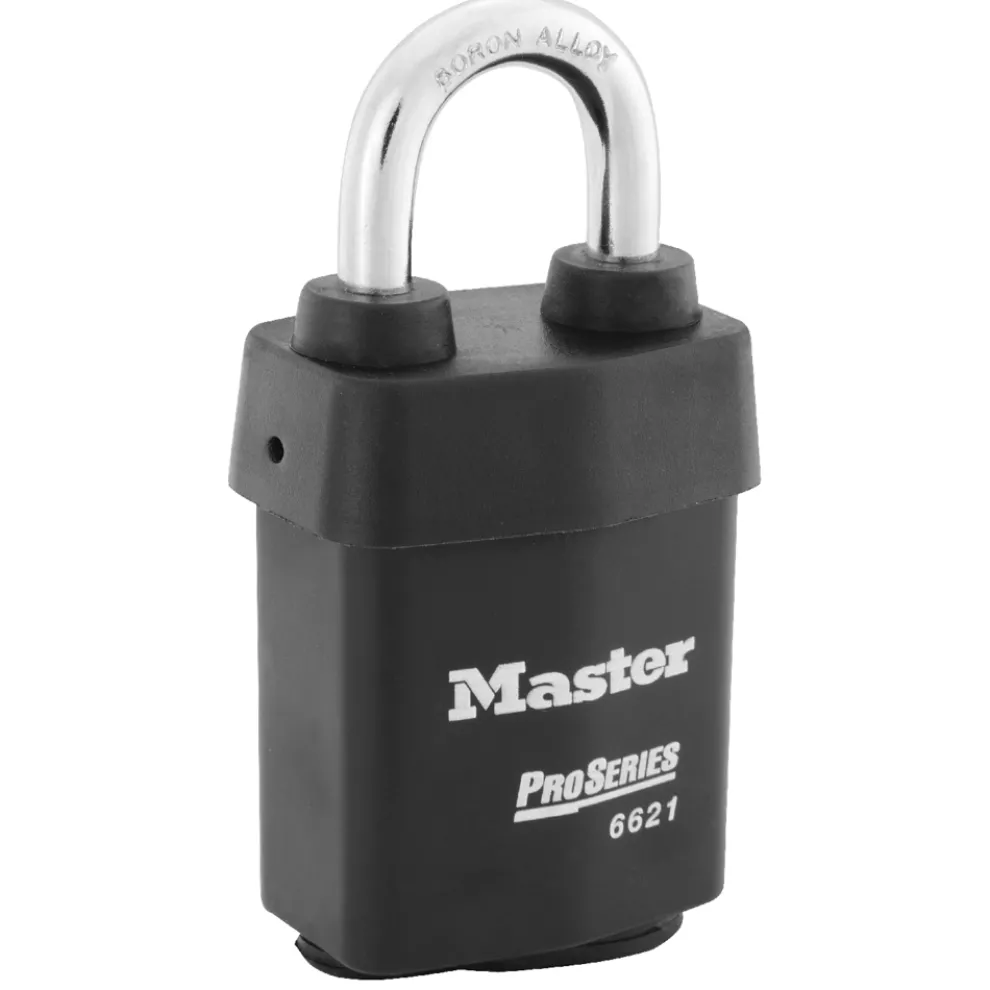 The Master Lock No. 6621 ProSeries® Weather Tough® Covered Laminated Padlock features a 2-1/8in (54mm) heavy steel body to withstand physical attack and a 1-1/8in (29mm) tall, 5/16in (8mm) diameter hardened boron alloy shackle for superior cut resistance. Padlock is available with our without cylinder to key at your facility with a choice of 22 Key-in-Knob keyways to match this padlock to your security door locks. The exclusive cover protects from water, ice, dirt and grime.