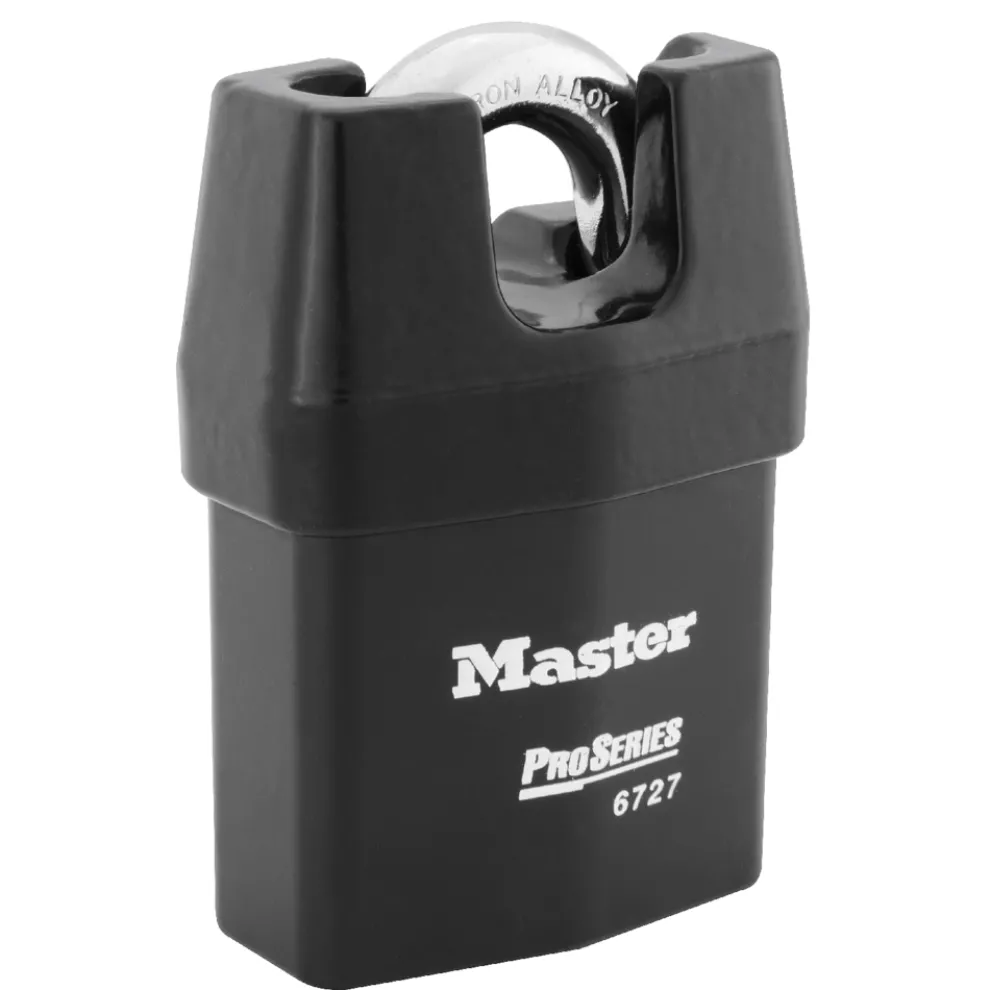 The Master Lock No. 6727 ProSeries® Weather Tough® Shrouded Padlock features a 2-5/8in (67mm) heavy steel body to withstand physical attack and a 3/4in (19mm) tall, 7/16in (11mm) diameter hardened boron alloy shackle for superior cut resistance. Padlock is available with our without cylinder to key at your facility with a choice of 22 Key-in-Knob keyways to match this padlock to your security door locks. The exclusive cover protects from water, ice, dirt and grime.