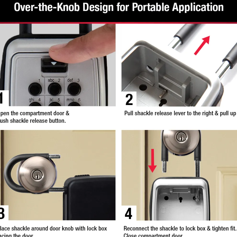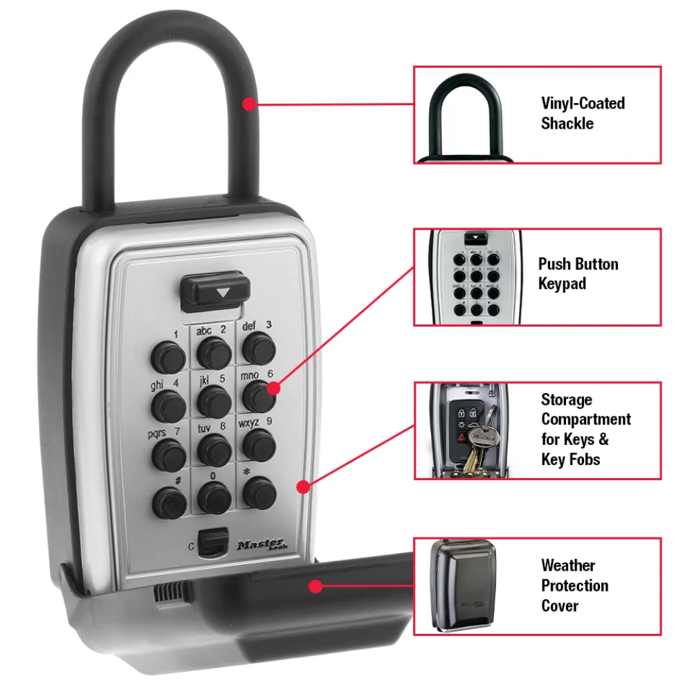 The Master Lock No. 5422D Portable Push Button Lock Box features a 3-1/8in (79mm) wide metal body for durability. The shackle design offers over the door mounting for convenience. Set your own 4 character combination for keyless convenience and increased security. The protective weather cover prevents freezing and jamming; and molded bumper and vinyl coated shackle prevent scratching. The Limited Lifetime Warranty provides peace of mind from a brand you can trust.