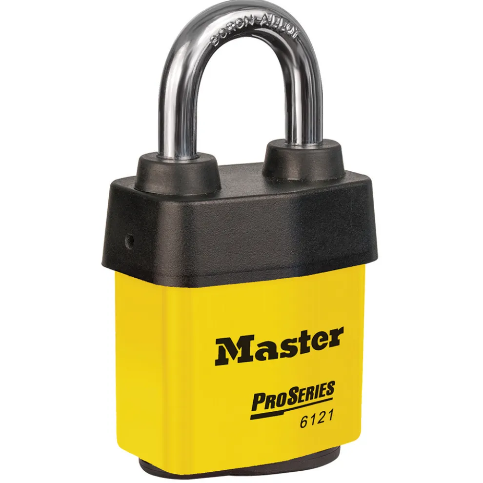 The Master Lock No. 6121KA ProSeries® Weather Tough® Covered Laminated Padlock, Keyed Alike – multiple locks open with the same key – features a 2-1/8in (54mm) wide heavy steel body to withstand physical attack and a 1-1/8in (29mm) tall, 5/16in (8mm) diameter hardened boron alloy shackle for superior cut resistance. The exclusive cover protects this padlock from harsh elements & a high security, rekeyable 5-pin cylinder with spool pins is virtually impossible to pick. The yellow, high visibility color cover provides the ability to distinguish between departments, employees, access, etc.