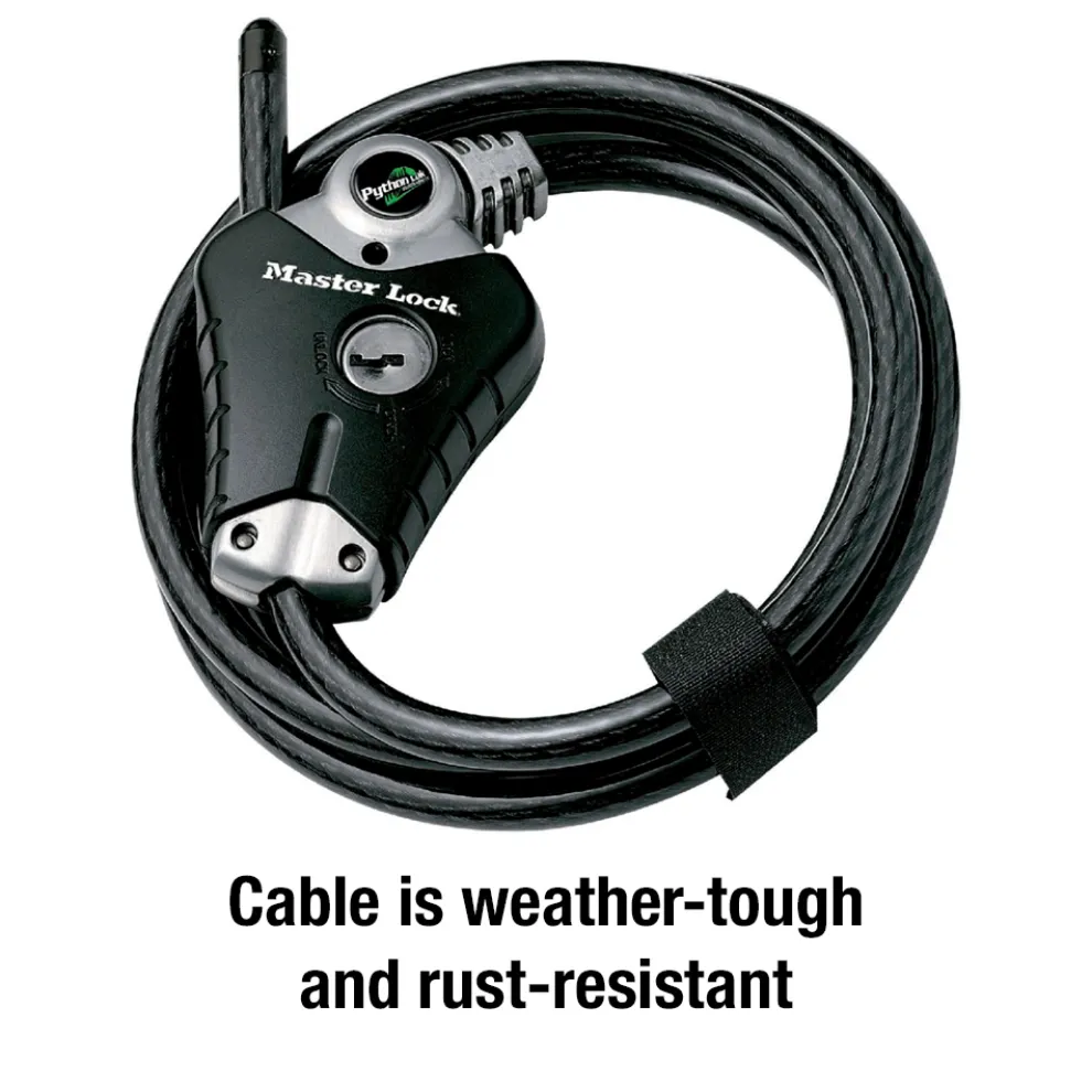 The Master Lock No. 8428DPS Python™ Adjustable Locking Cable 6ft (1.8m) long and features 3/8in (10mm) diameter braided steel for maximum strength and flexibility. The protective vinyl coating protects against scratches. The wafer cylinder offers maximum pick resistance. The rust resistant lock and vinyl coated cable provide superior weather and scratch resistance. The Limited Lifetime Warranty provides peace of mind from a brand you can trust.