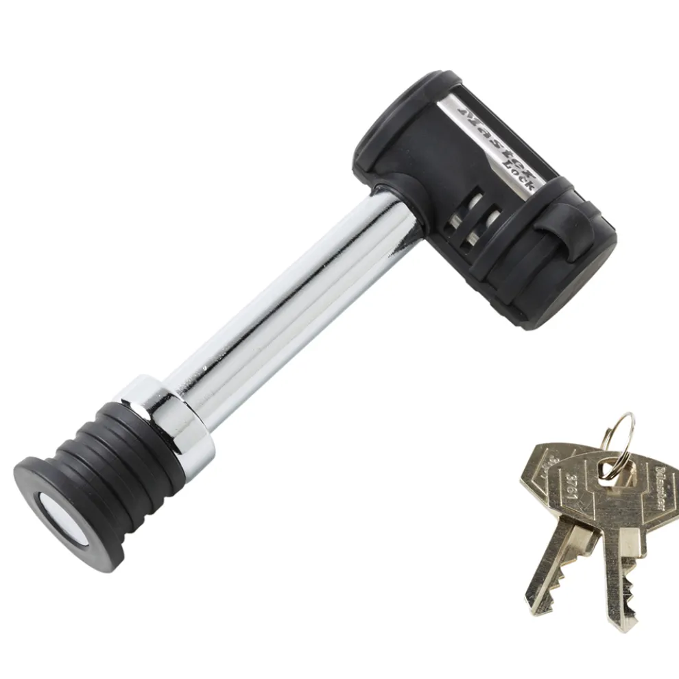 The Master Lock No. 1479DAT features a 5/8in (16mm) Class III/IV Barbell™ receiver lock. The receiver lock includes the Push to Lock™ locking mechanism, easily used by pushing the lock body firmly onto the pin and removing the key. The Weather Tough® seal and water tight cap provides additional protection from moisture and dirt. The Limited Lifetime Warranty provides peace of mind from a brand you can trust.