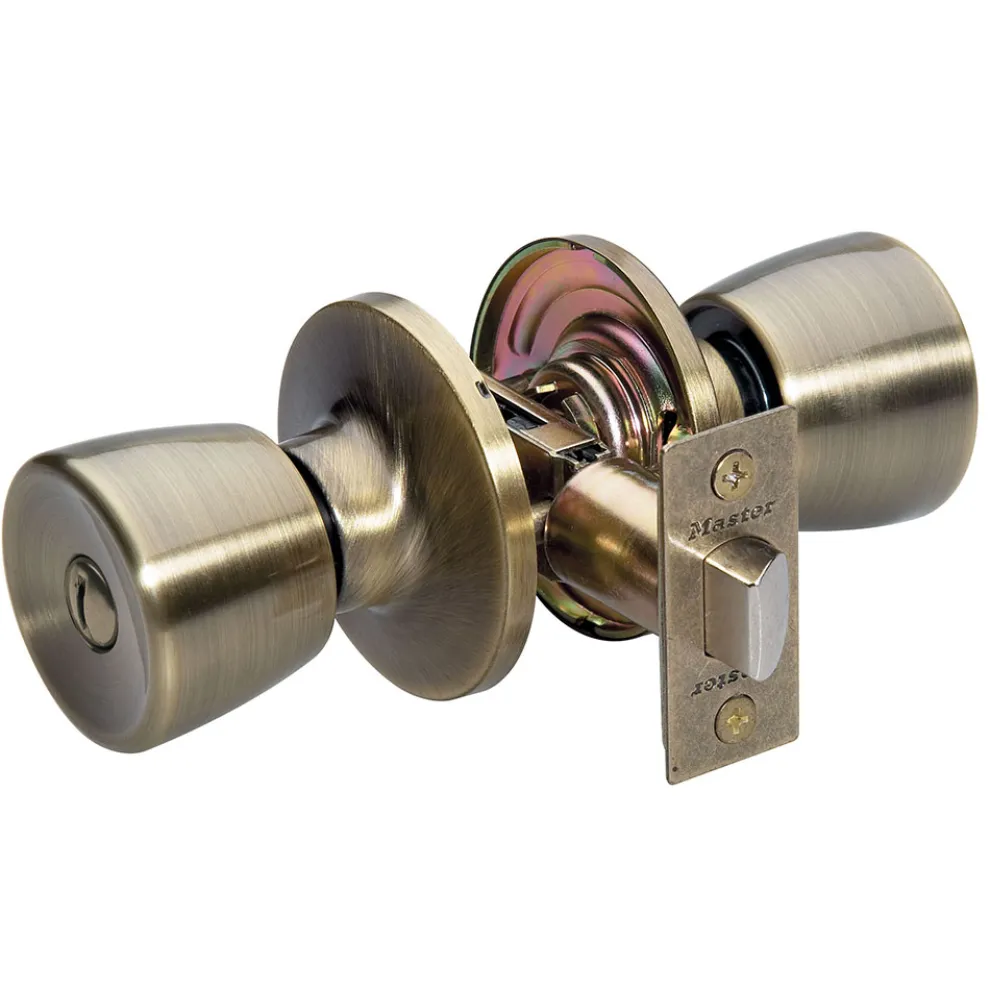 The Master Lock No. TUO0305 features a tulip style knob with six-way adjustable latch to fit all doors with 2-3/8in or 2-3/4in backset, square, rounded corners, or drive-in. This knob offers ANSI Grade 3 performance for interior locking applications. The antique brass finish provides a sleek appearance. The Ten Year Limited Warranty provides peace of mind from a brand you can trust.