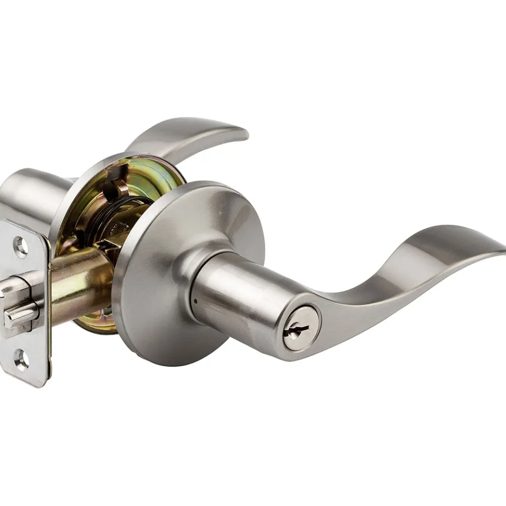 The Master Lock No. WL0115 features a wave style lever with six-way adjustable latch to fit all doors with 2-3/8in or 2-3/4in backset, square, rounded corners, or drive-in. This knob offers ANSI Grade 3 performance for exterior locking applications. The satin nickel finish provides a sleek appearance. The Ten Year Limited Warranty provides peace of mind from a brand you can trust.