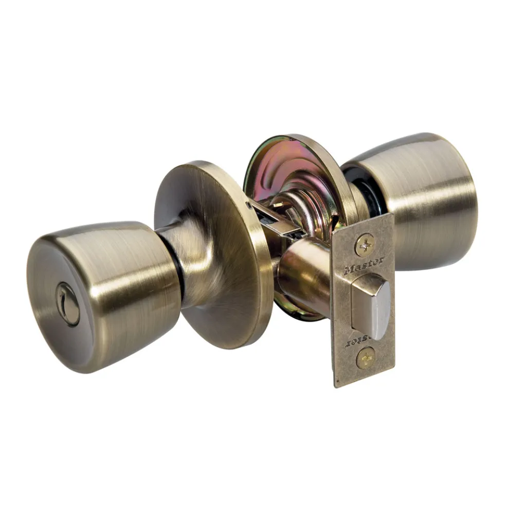 The Master Lock No. TU0305BOX features a tulip style knob with six-way adjustable latch to fit all doors with 2-3/8in or 2-3/4in backset, square, rounded corners, or drive-in. This knob offers ANSI Grade 3 performance for interior locking applications. The antique brass finish provides a sleek appearance. The Ten Year Limited Warranty provides peace of mind from a brand you can trust.