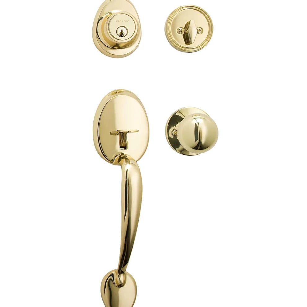 The Master Lock No. HDLBA0603 features a handleset with ball style interior knob; and single cylinder deadbolt, with interior thumb turn. The six-way adjustable latch fits all doors with 2-3/8in or 2-3/4in backset, square, rounded corners, or drive-in. The deadbolt is four way adjustable for 2-3/8in or 2-3/4in backset, square, or rounded corners. This handleset and deadbolt combo pack is ANSI Grade 3 and designed for exterior door applications. The polished brass finish provides a sleek appearance. The Ten Year Limited Warranty provides peace of mind from a brand you can trust.