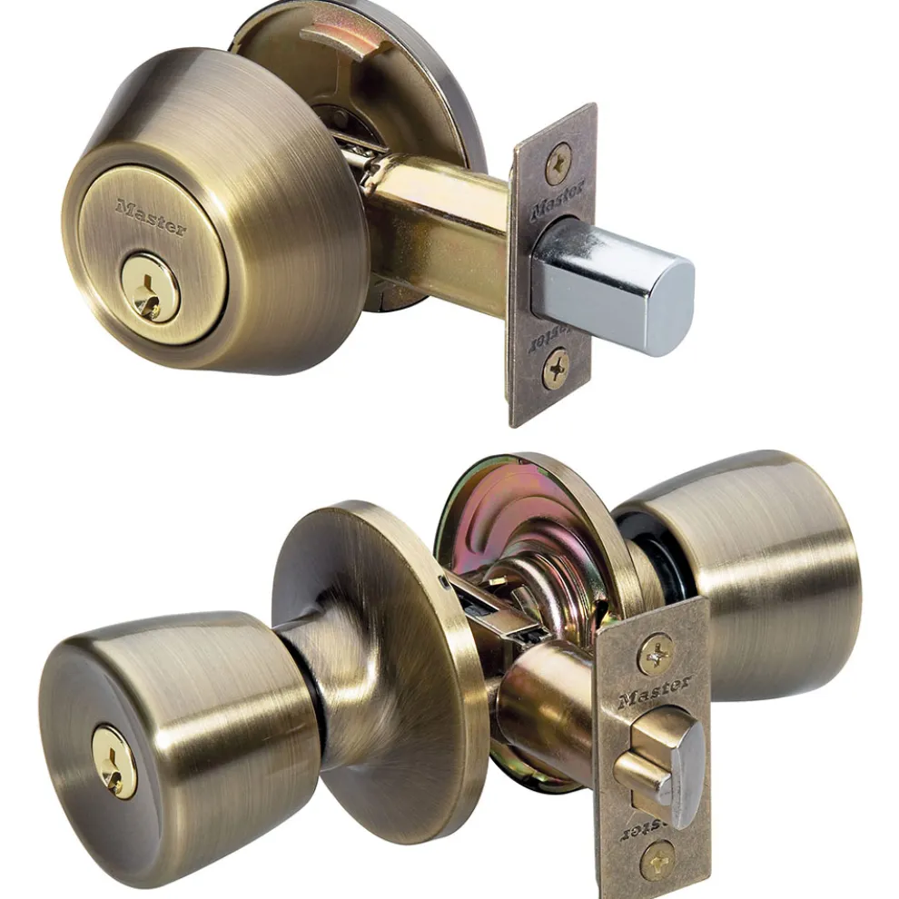 The Master Lock No. TUCO0605 features a keyed alike tulip style knob and single cylinder deadbolt, with interior thumb turn. The six-way adjustable latch fits all doors with 2-3/8in or 2-3/4in backset, square, rounded corners, or drive-in. The deadbolt is four way adjustable for 2-3/8in or 2-3/4in backset, square, or rounded corners. This knob and deadbolt combo pack is ANSI Grade 3 and designed for exterior door applications. The antique brass finish provides a sleek appearance. The Ten Year Limited Warranty provides peace of mind from a brand you can trust.