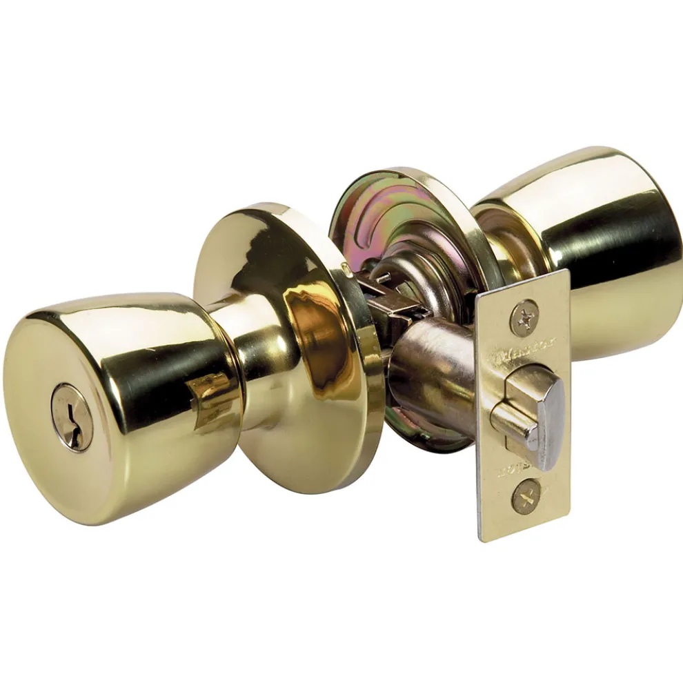 The Master Lock No. TUO0103 features a tulip style knob with six-way adjustable latch to fit all doors with 2-3/8in or 2-3/4in backset, square, rounded corners, or drive-in. This knob offers ANSI Grade 3 performance for exterior locking applications. The polished brass finish provides a sleek appearance. The Ten Year Limited Warranty provides peace of mind from a brand you can trust.
