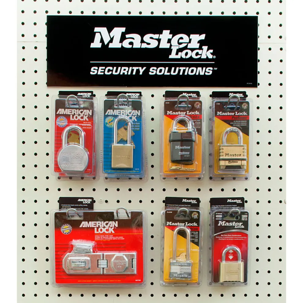 The Master Lock No. 1315 Security Hardware Wall Display product kit features 7 top selling Master Lock and American Lock commercial products, product detail cards and a Master Lock Security Solutions™ header card. The wall display merchandising kit is designed to generate customer interaction and impulse sales. Each product assortment includes two of each product for a “one to show, one to sell” approach.