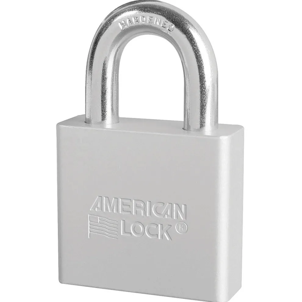 The American Lock No. A1305CLR Solid Aluminum Padlock features a 2in (51mm) wide aluminum silver body and a 1-1/8in (29mm) tall, 3/8in (10mm) diameter boron shackle for superior cut resistance. Dual ball bearing locking mechanism resists pulling and prying and 5-pin APTC12 rekeyable cylinder is pick resistant and has tens of thousands of key changes.