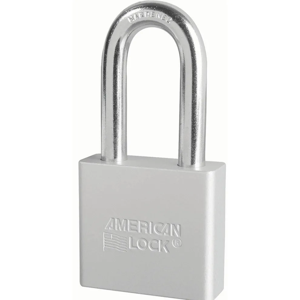 The American Lock No. A1306CLR Solid Aluminum Padlock features a 2in (51mm) wide aluminum silver body and a 2in (51mm) tall, 3/8in (10mm) diameter boron shackle for superior cut resistance. Dual ball bearing locking mechanism resists pulling and prying and 5-pin APTC12 rekeyable cylinder is pick resistant and has tens of thousands of key changes.