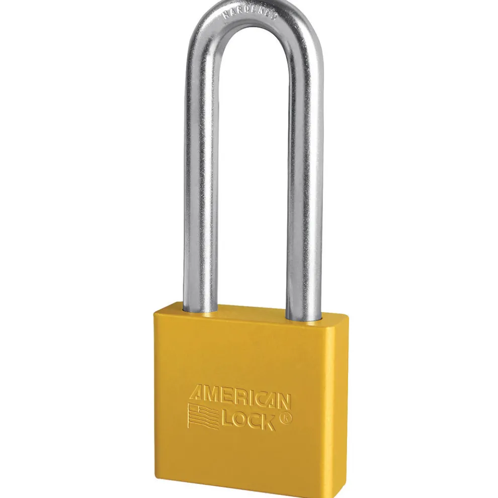 The American Lock No. A1307KAYLW Solid Aluminum Padlock, Keyed Alike – multiple locks open with the same key – features a 2in (51mm) wide aluminum yellow body and a 3in (75mm) tall, 3/8in (10mm) diameter boron shackle for superior cut resistance. Dual ball bearing locking mechanism resists pulling and prying and 5-pin APTC12 rekeyable cylinder is pick resistant and has tens of thousands of key changes.