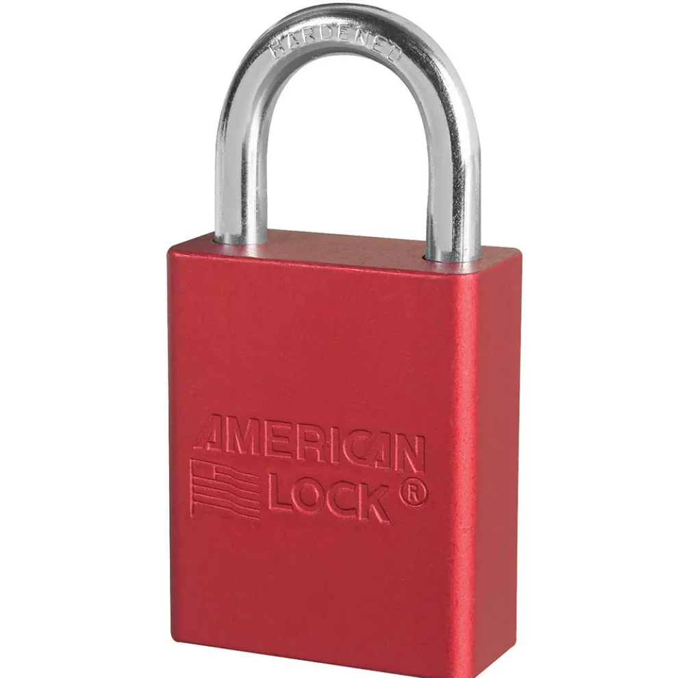 The American Lock No. A3105KARED Small Format Interchangeable Core Solid Aluminum Padlock, Keyed Alike – multiple locks open with the same key – features a 1-1/2in (38mm) wide red aluminum body and a 1in (25mm) tall, 1/4in (6mm) diameter hardened boron shackle for superior cut resistance. Solid aluminum body is corrosion resistant, ideal for harsh environments while also being spark resistant and lightweight. A dual ball bearing mechanism resists pulling and prying and 16 interchangeable core keyways are available to match your door security system.