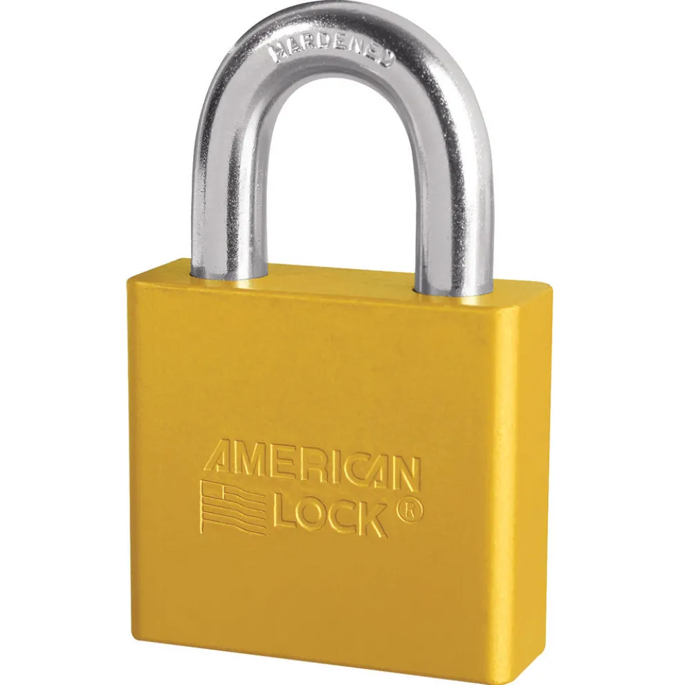 The American Lock No. A1365KAYLW Solid Aluminum Padlock, Keyed Alike – multiple locks open with the same key – features a 2in (51mm) wide aluminum yellow body and a 1-1/8in (29mm) tall, 3/8in (10mm) diameter boron shackle for superior cut resistance. Dual ball bearing locking mechanism resists pulling and prying and 6-pin APTC14 rekeyable cylinder is pick resistant and has tens of thousands of key changes.