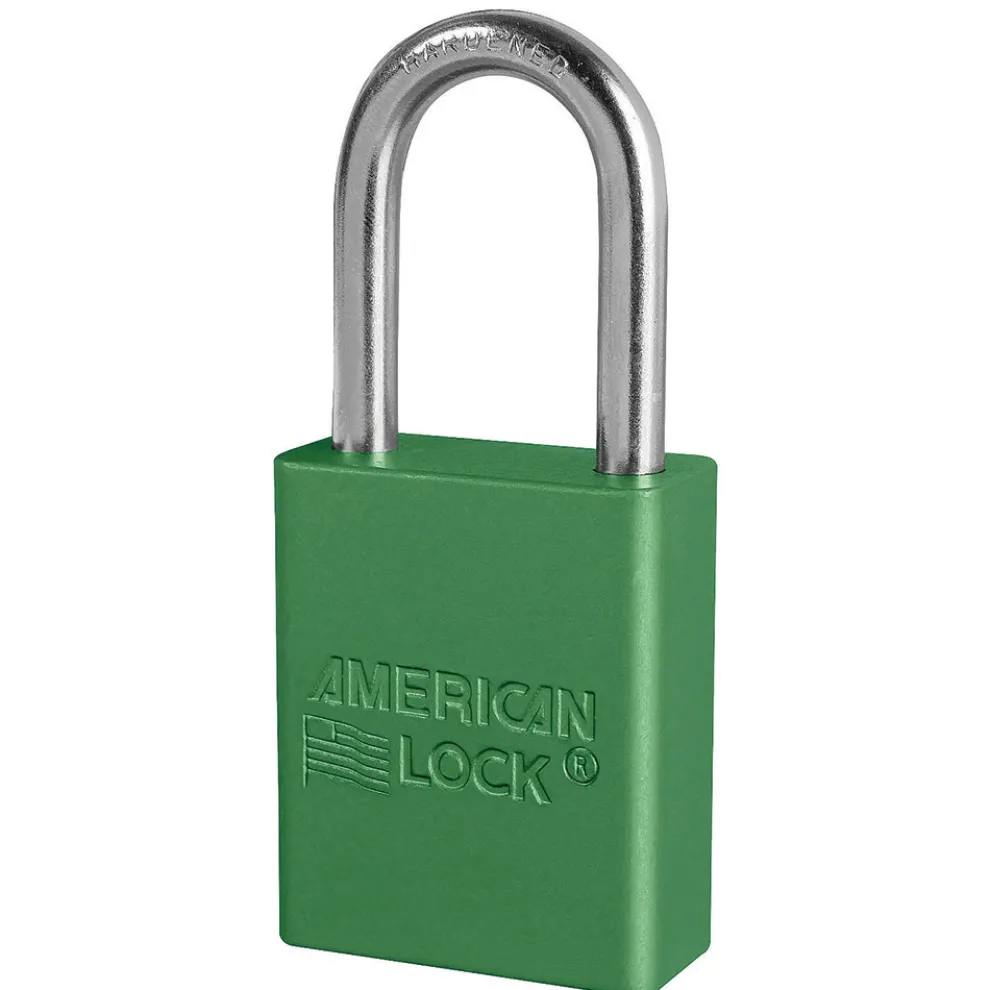 The American Lock No. A3106GRN Small Format Interchangeable Core Solid Aluminum Padlock features a 1-1/2in (38mm) wide green aluminum body and a 1-1/2in (38mm) tall, 1/4in (6mm) diameter hardened boron shackle for superior cut resistance. Solid aluminum body is corrosion resistant, ideal for harsh environments while also being spark resistant and lightweight. A dual ball bearing mechanism resists pulling and prying and 16 interchangeable core keyways are available to match your door security system.