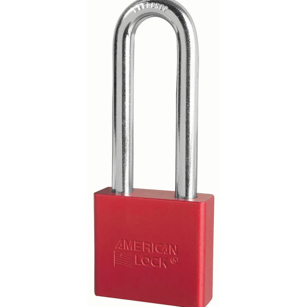 The American Lock No. A1367KARED Solid Aluminum Padlock, Keyed Alike – multiple locks open with the same key – features a 3in (75mm) wide aluminum red body and a 2in (51mm) tall, 3/8in (10mm) diameter boron shackle for superior cut resistance. Dual ball bearing locking mechanism resists pulling and prying and 6-pin APTC14 rekeyable cylinder is pick resistant and has tens of thousands of key changes.