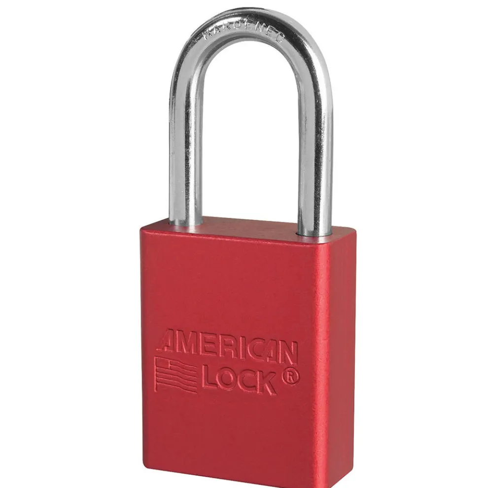 The American Lock No. A3106KARED Small Format Interchangeable Core Solid Aluminum Padlock, Keyed Alike – multiple locks open with the same key – features a 1-1/2in (38mm) wide red aluminum body and a 1-1/2in (38mm) tall, 1/4in (6mm) diameter hardened boron shackle for superior cut resistance. Solid aluminum body is corrosion resistant, ideal for harsh environments while also being spark resistant and lightweight. A dual ball bearing mechanism resists pulling and prying and 16 interchangeable core keyways are available to match your door security system.