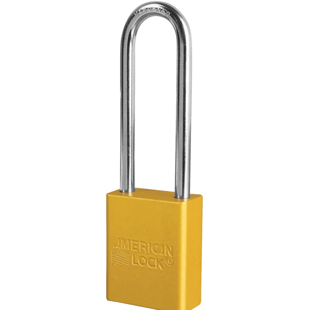 The American Lock No. A3107KAYLW Small Format Interchangeable Core Solid Aluminum Padlock, Keyed Alike – multiple locks open with the same key – features a 1-1/2in (38mm) wide yellow aluminum body and a 3in (75mm) tall, 1/4in (6mm) diameter hardened boron shackle for superior cut resistance. Solid aluminum body is corrosion resistant, ideal for harsh environments while also being spark resistant and lightweight. A dual ball bearing mechanism resists pulling and prying and 16 interchangeable core keyways are available to match your door security system.