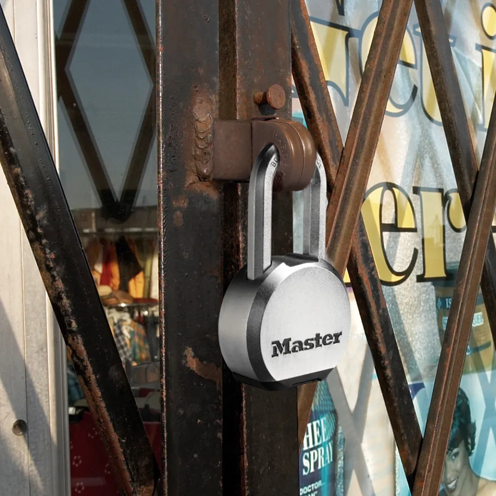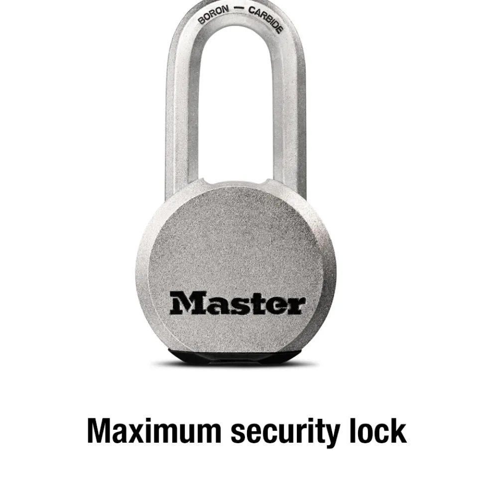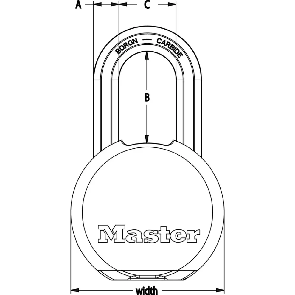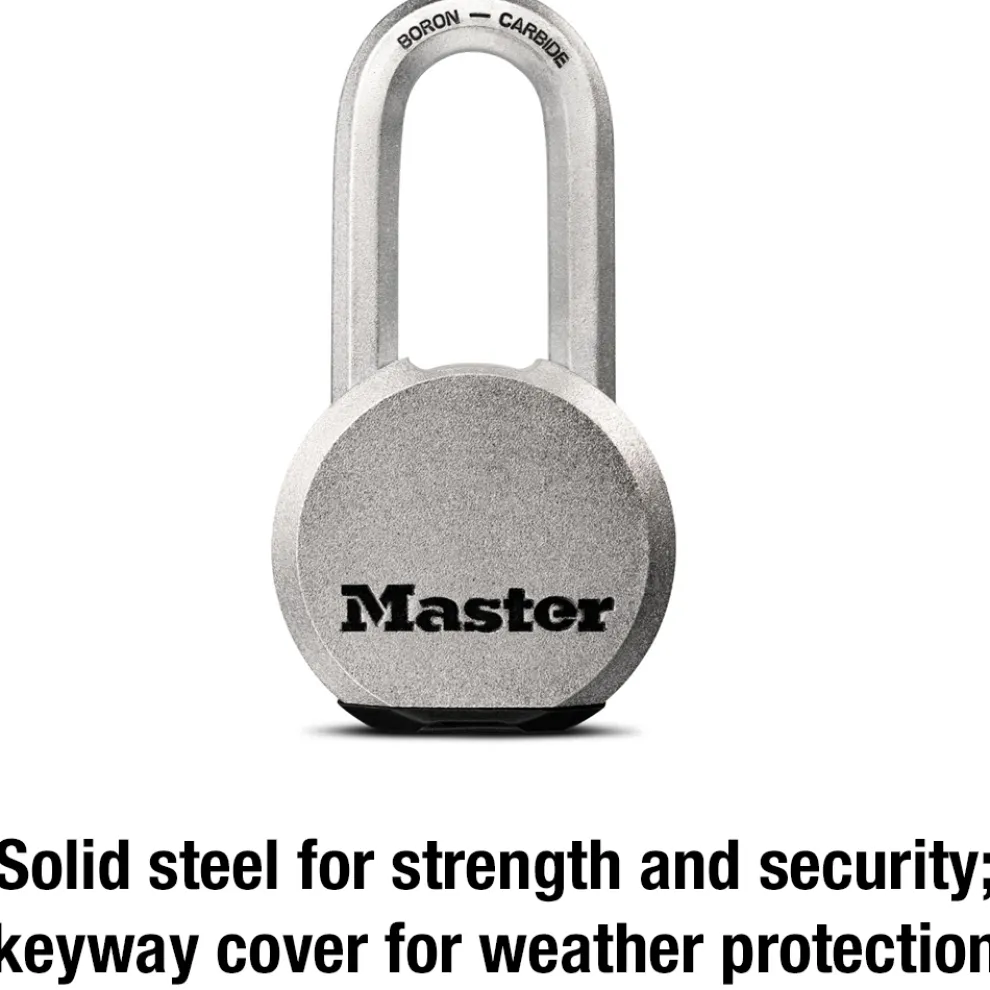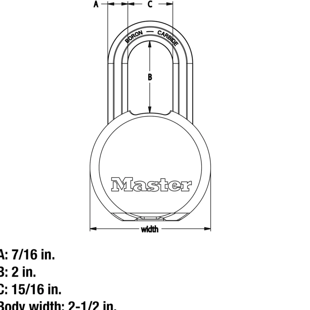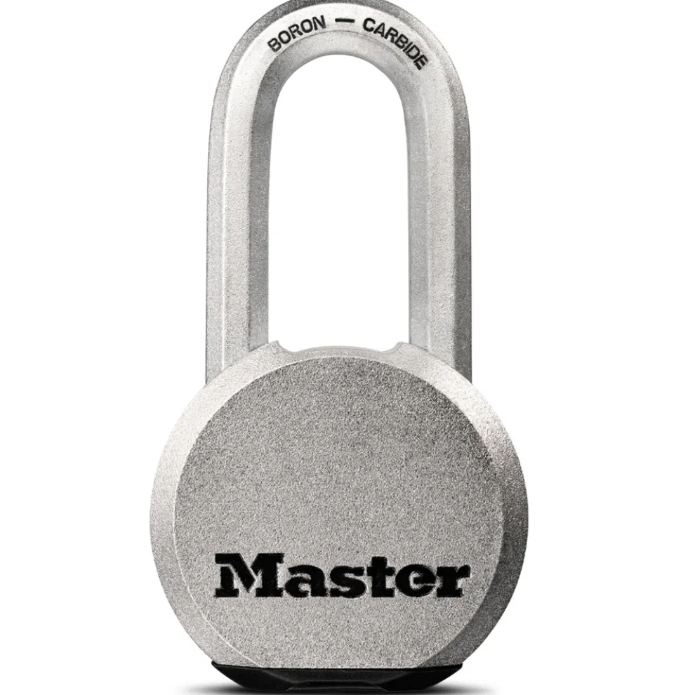 The Master Lock Magnum® No. M930XDLH Solid Body Padlock features a 2-1/2in (64mm) wide solid steel body for maximum strength and reliability. The 7/16in (11mm) diameter octagonal shackle is 2in (51mm) long and made of Tough-Cut™ boron-carbide, 50% harder than hardened steel, offering maximum resistance to cutting and sawing. The 5-pin cylinder prevents picking and the dual locking ball bearings provide maximum resistance against prying and hammering. The covered keyway offers maximum weather protection, and reinforced body bumper protects against scratches. The Lifetime Guarantee provides peace of mind from a brand you can trust.