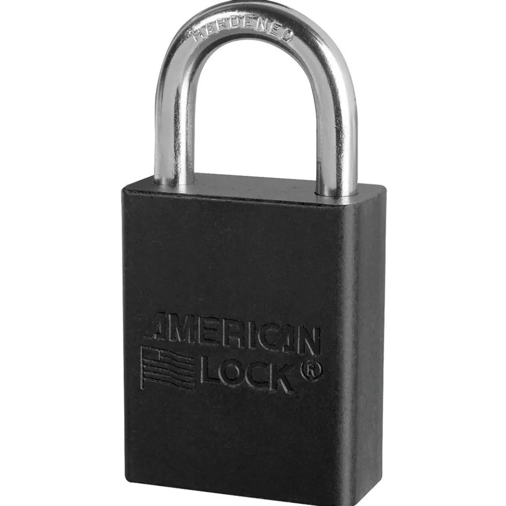 The American Lock No. A3105BLK Small Format Interchangeable Core Solid Aluminum Padlock features a 1-1/2in (38mm) wide black aluminum body and a 1in (25mm) tall, 1/4in (6mm) diameter hardened boron shackle for superior cut resistance. Solid aluminum body is corrosion resistant, ideal for harsh environments while also being spark resistant and lightweight. A dual ball bearing mechanism resists pulling and prying and 16 interchangeable core keyways are available to match your door security system.