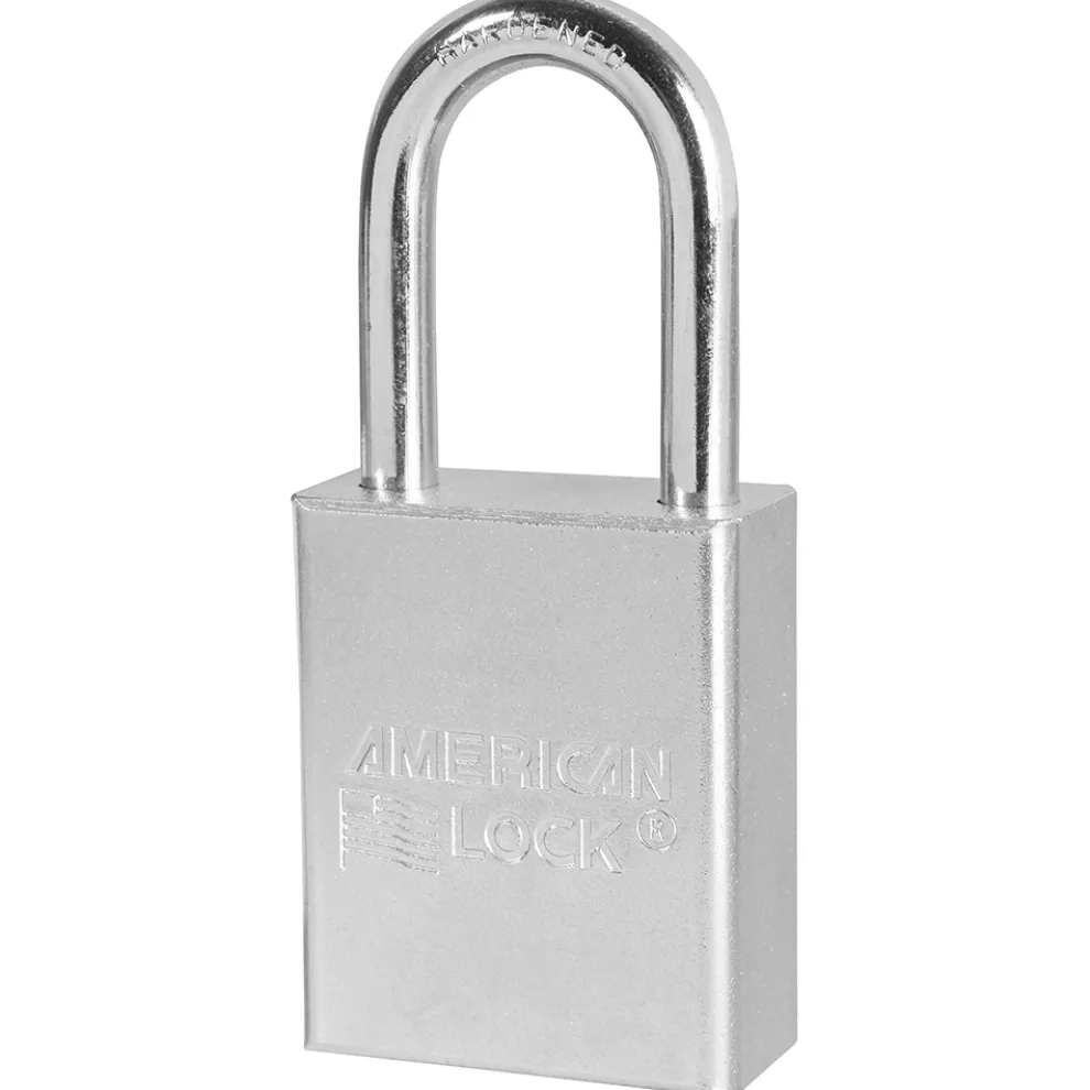The American Lock No. A5101 Solid Steel Padlock features a 1-1/2in (38mm) wide hardened, chrome plated solid steel body to resist cutting, sawing and corrosion and a 1-1/2in (38mm) tall, 1/4in (6mm) diameter hardened boron alloy shackle for superior cut resistance. Easy to service with a 5-pin APTC12 rekeyable cylinder, this padlock is ideal for securing gates, sheds, truck/van doors and industrial machinery.
