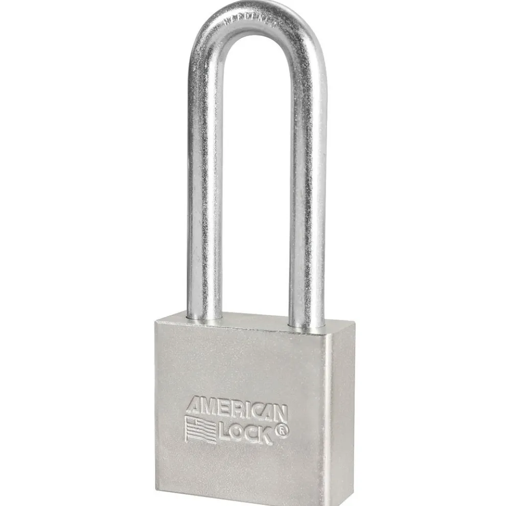 The American Lock No. A52 Solid Steel Padlock features a 2in (51mm) wide solid steel body and a 3in (75mm) tall, 3/8in (10mm) diameter hardened boron alloy shackle for superior cut resistance. A dual ball bearing locking mechanism resists pulling and prying while the 5-pin non-rekeyable cylinder with serrated pins is virtually impossible to pick.