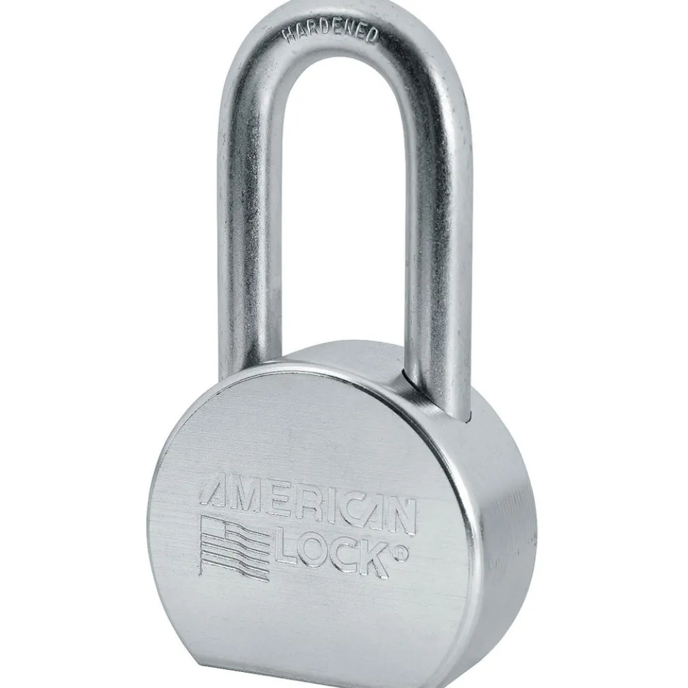 The American Lock A703 Solid Steel Padlock features a 2-1/2in (64mm) wide case hardened, zinc plated solid steel body with a 2in (51mm) tall, 7/16in (11mm) diameter hardened boron alloy shackle for superior cut resistance. A dual ball bearing locking mechanism resists pulling and prying. For extra security, the 5-pin APTC12 rekeyable cylinder with serrated pins is virtually impossible to pick.