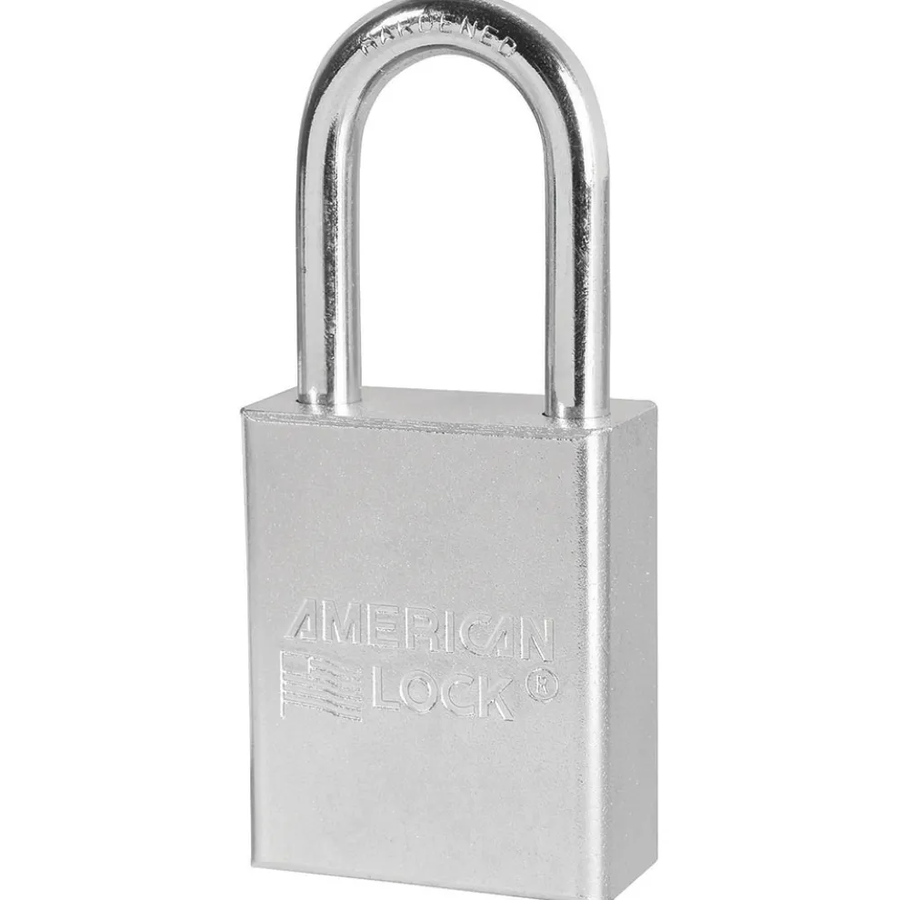 The American Lock No. A6101 Solid Steel Padlock features a 1-1/2in (38mm) wide hardened, chrome plated solid steel body to resist cutting, sawing and corrosion and a 1-1/2in (38mm) tall, 1/4in (6mm) diameter hardened boron alloy shackle for superior cut resistance. Easy to service with a 6-pin APTC14 rekeyable cylinder, this padlock is ideal for securing gates, sheds, truck/van doors and industrial machinery.