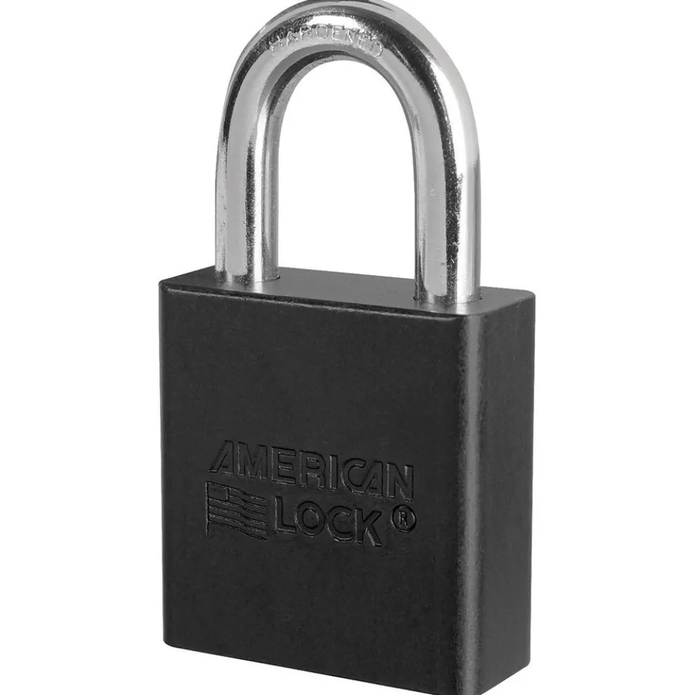 The American Lock No. A1205BLK Solid Aluminum padlock features a 1-3/4in (44mm) wide aluminum, black body and a 1-1/8in (29mm) tall, 5/16in (8mm) diameter hardened boron alloy steel shackle for superior cut resistance. Ideal for Safety Lockout, padlock is lightweight and available in a variety of anodized finishes for easy identification. Dual ball bearing locking mechanism resists pulling and prying and 5-pin APTC12 rekeyable cylinder is pick resistant and has tens of thousands of key changes.