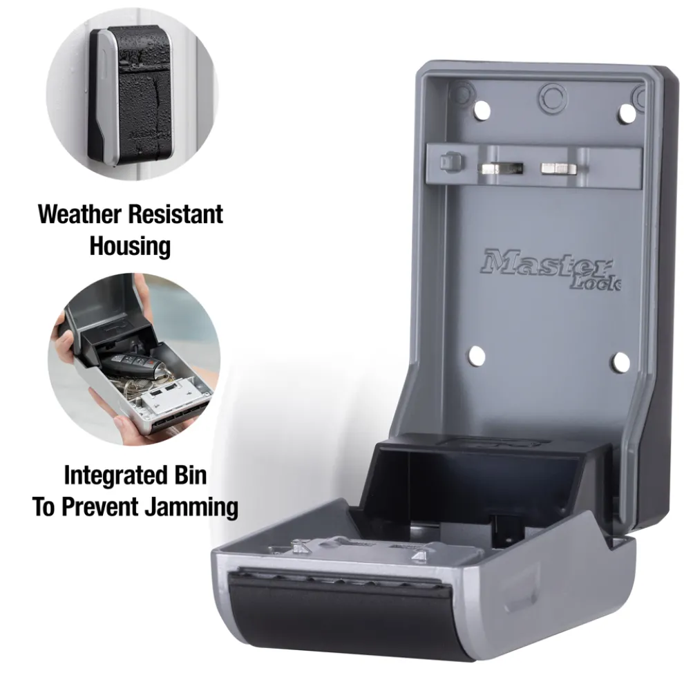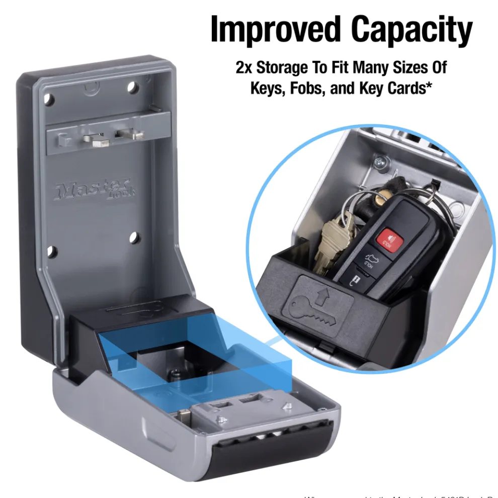 The Master Lock 5481D Outdoor Wall Mount Key Lock Box, sets a new standard for convenient security. It offers tried-and-true protection you can count on and easy operation for anyone accessing your home or property. Based on our previous model, this key safe is larger than others, with a storage capacity that protects not only your keys, but also fobs and access cards. This redesigned key safe simplifies and streamlines day-to-day life. The new innovative built-in bin holds your keys in place to prevent jamming, and has ergonomic dials, making the lock box easy to open with one hand. The solid metal body means your keys, fobs, and cards are safe from both harsh weather and tampering attempts. Wall mounting installation means a permanent location to share and protect your keys. Whether it’s your home, business, or job site, this key box offers a reliable and convenient solution for granting access to trusted people.